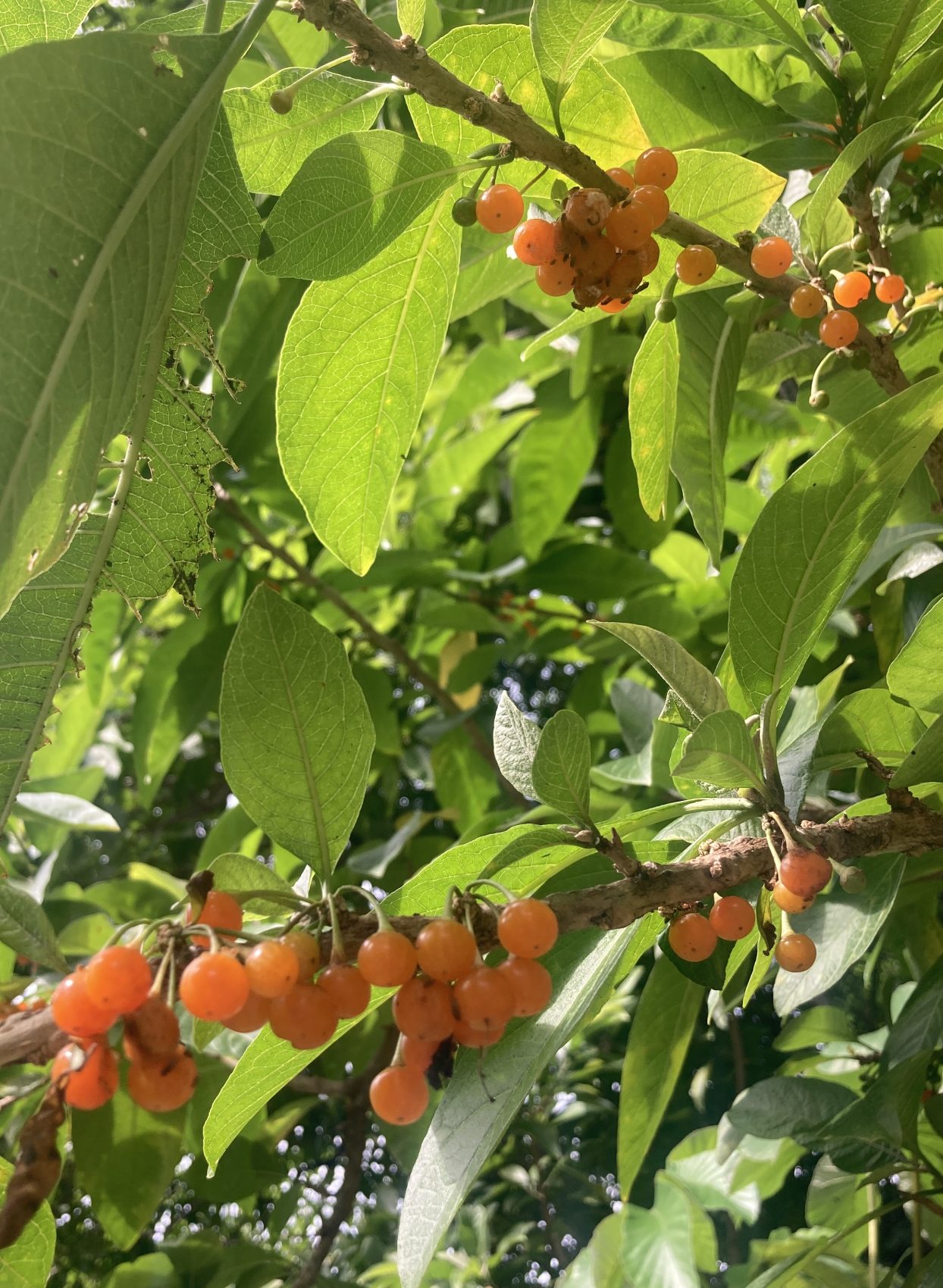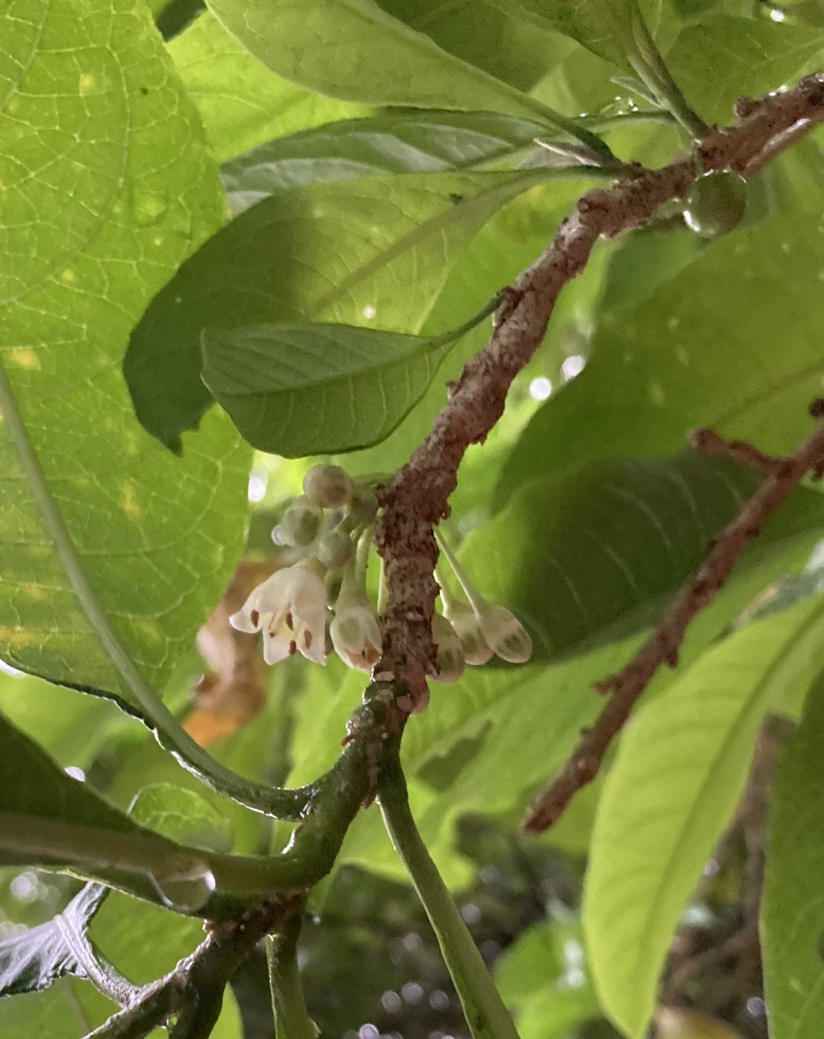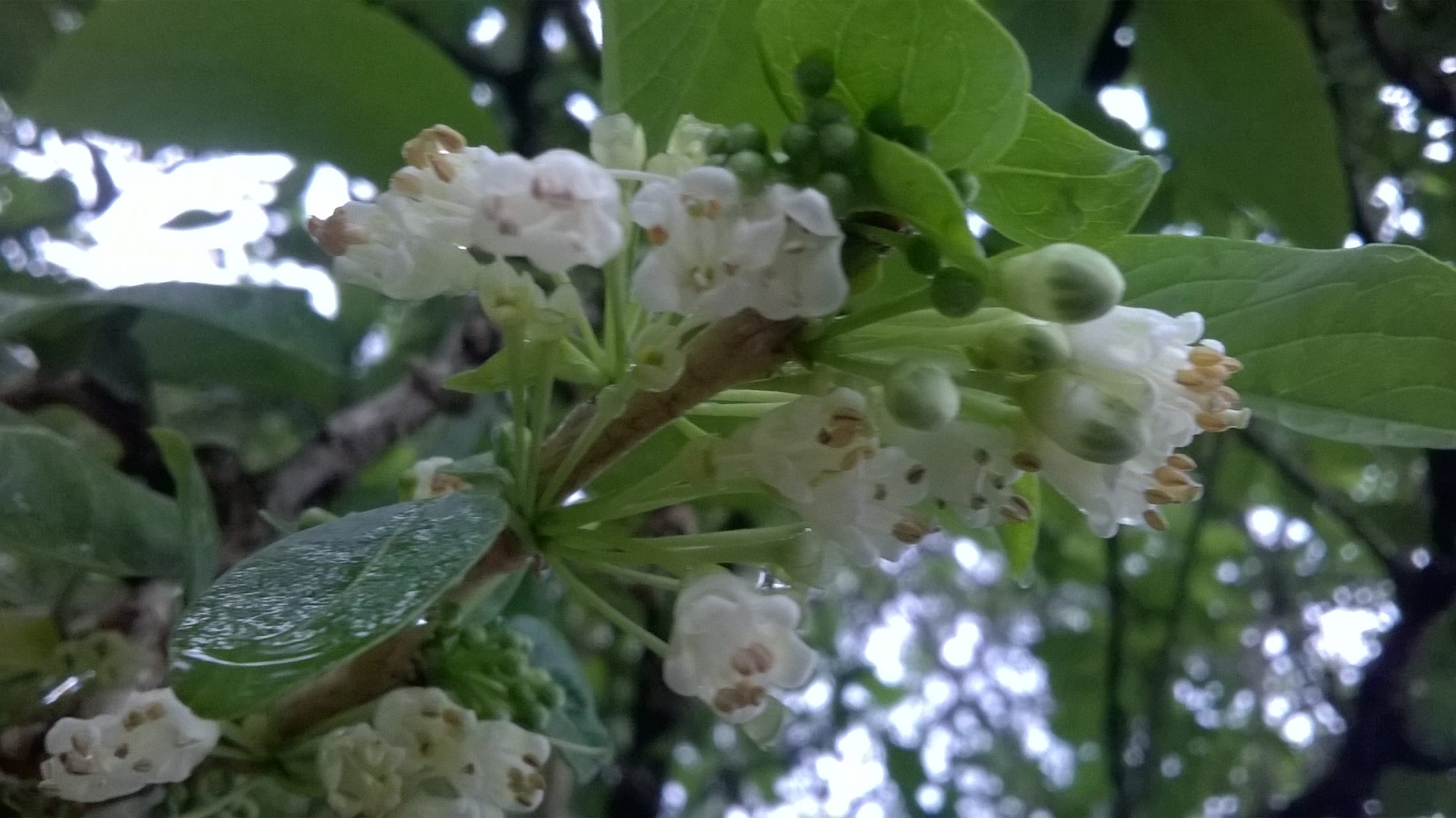 Güitite’s white flowers appear in bundles from leaf axils along bare portions of the branches from which leaves have already been lost. The prominent corolla consists of five fused petals that form a bell-shaped tube that ends in five, flaring points. Inside, an equal number of white-stalked, tan-anthered stamens surround a central pistil. Flowering occurs at the end if the dry season, around April and May. The small fruits (0.8cm) then grow rapidly, maturing as they change color from glossy green to bright orange as spherical berries.