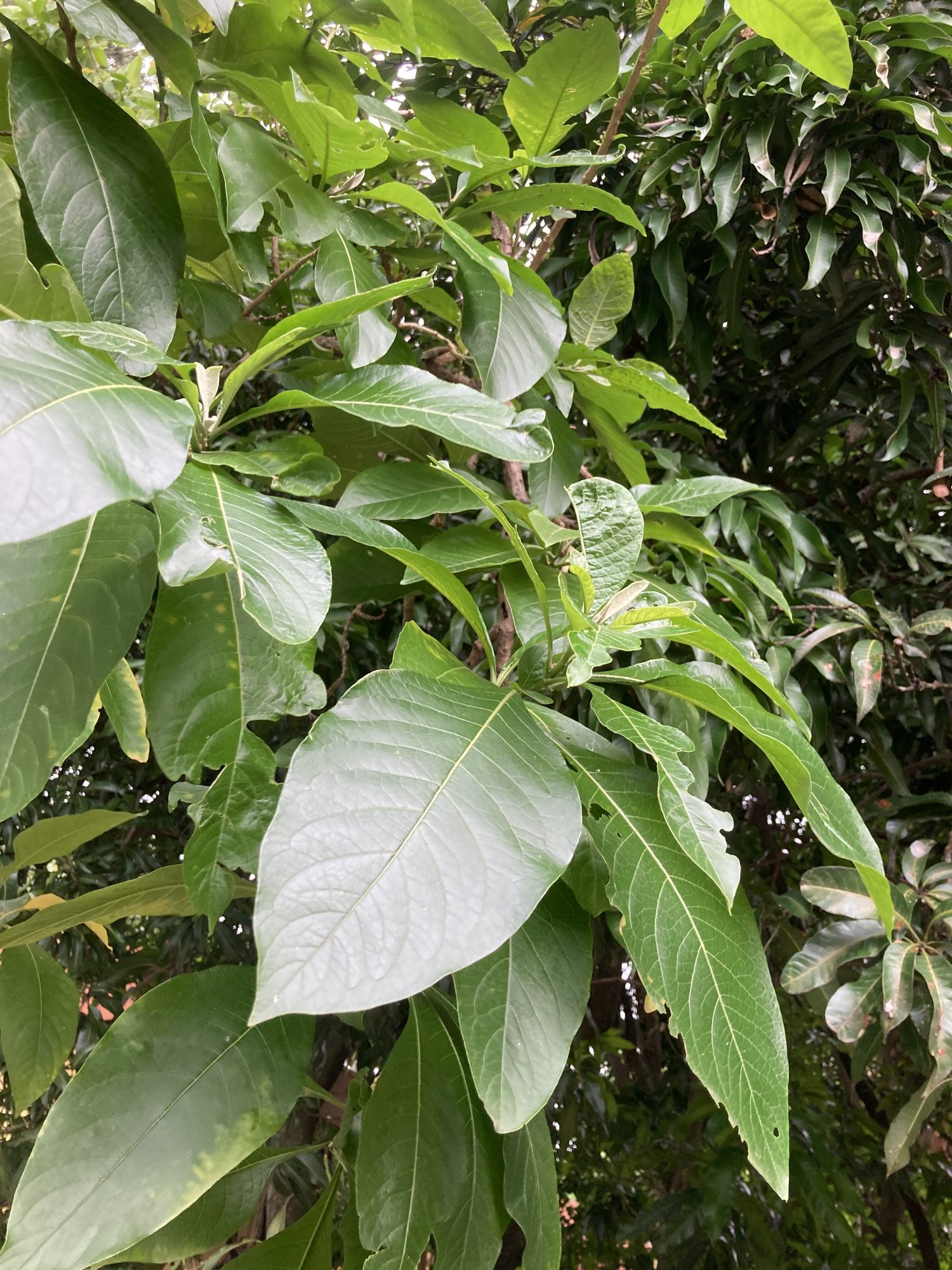 Leaves (24cm x 10cm) are large, simple, and alternate. Bades are elliptical, thin, papery, and have pronounced, pinnate venation. Short-lived, the foliage continuously yellows and is shed, as new growth renews the crown.