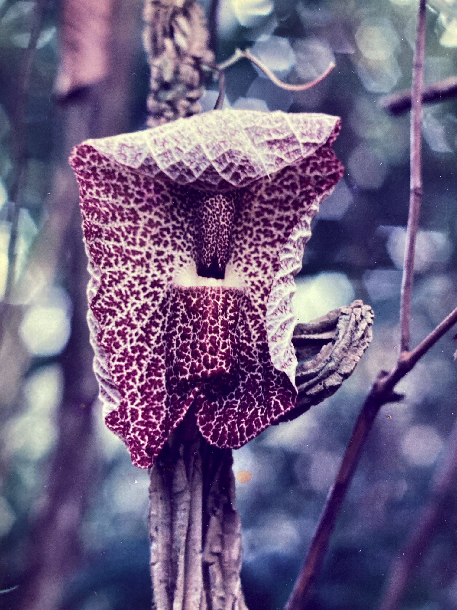 Flowers emerge from the lower, woody, leafless portion of the vine. Each is composed of a large (16 cm by 12 cm) and stunning, orbicular calyx (petals are lacking) of finely mottled maroon and white coloration. Though smooth, the maroon portions of the flower appear velvety and raised. In the center of the calyx is a projecting lip that covers an opening that leads into the interior of the flower, where the stamens and pistil are located. Bearing some resemblance to the pitchers produced by some carnivorous plants, Aristolochia flowers are nevertheless vegetarian (they do not consume insects!). The intensity and duration of blossoming varies from year to year but flowers are generally present from late October through November, occasionally continuing into December. Fruits are rarely seen but they begin as 12 cm, sausage-shaped capsules, also found growing on the lower, thick-barked portion of the vine. When mature, they dry and split into five sections, releasing many minute, winged seeds. Capsules mature in February and March.