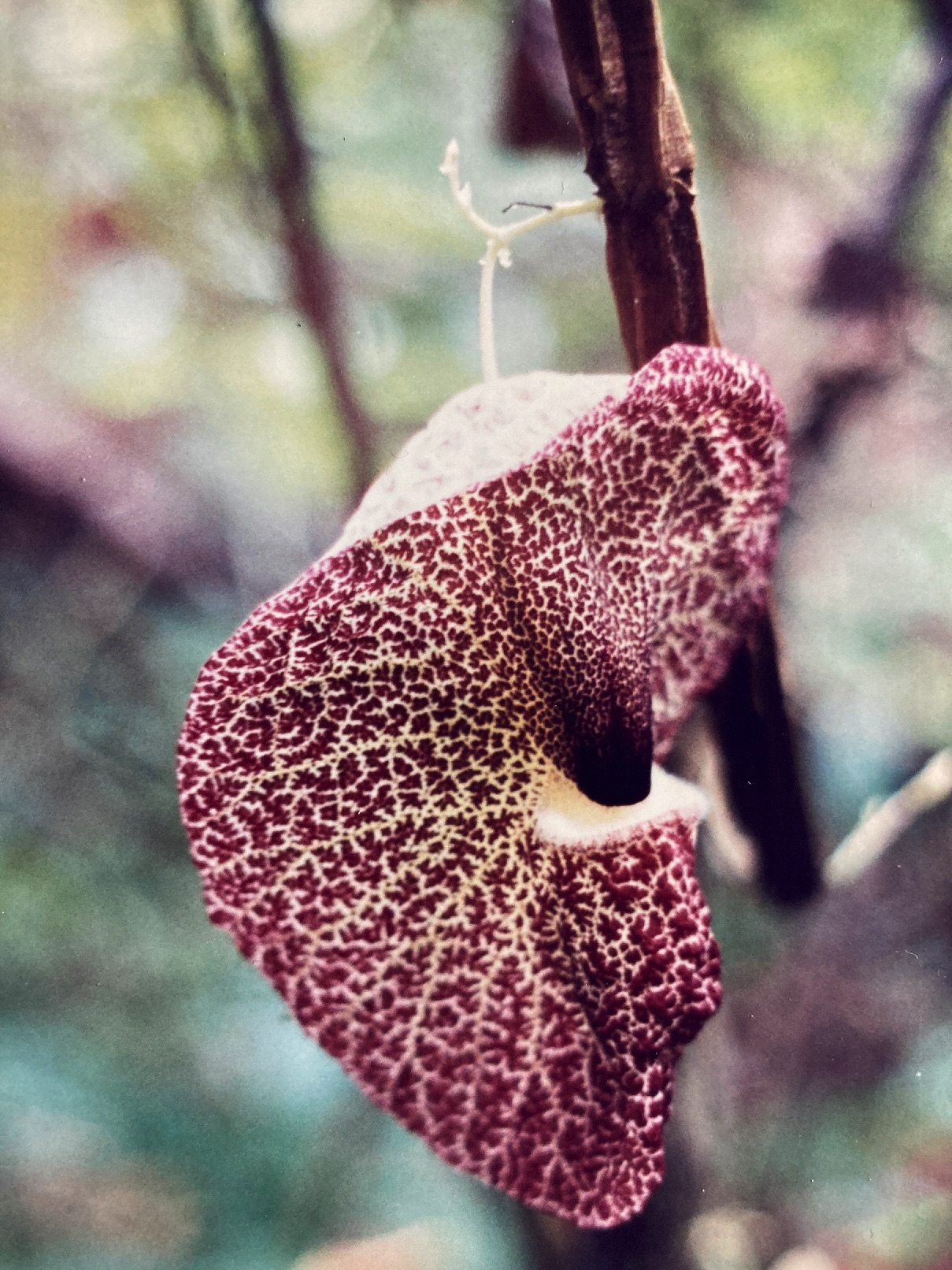 Description: Aristolochia gigantea is a climbing vine that grows to heights of several meters by twining its stem around the thin trunks and branches of understory shrubs and treelets. Basal portions of the stem can live for years and become quite thickened – reaching 4 or 5 cm in diameter. Older stems also develop thick, corky layers of tan-colored bark, characteristically contoured by deep, vertical grooves. Foliage is found only on the actively growing parts of the vine, where stems are thin, green and fresh. Aristolochia leaves are large, simple, and alternately arranged. The smooth, entire blades are thin and of cordate (heart) shape. A pattern of five, palmate main veins traverses the blade and converges at its base, where a long (5 cm) petiole is attached.