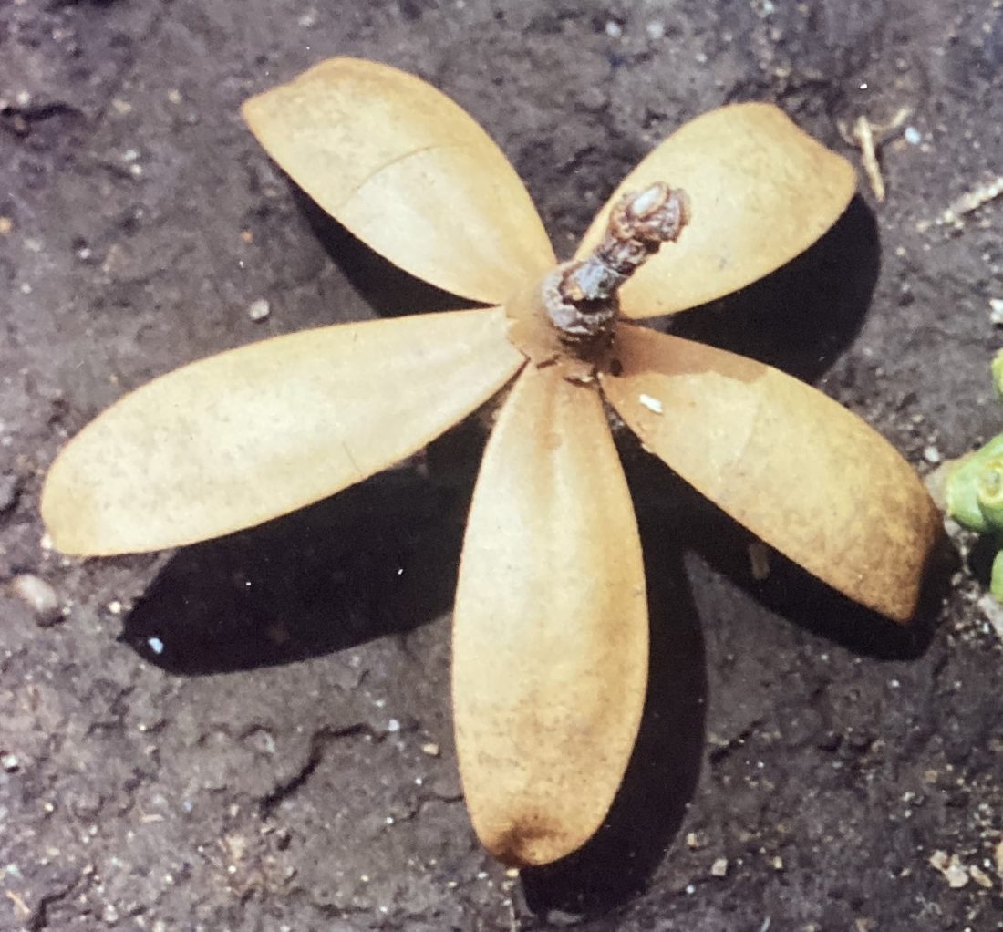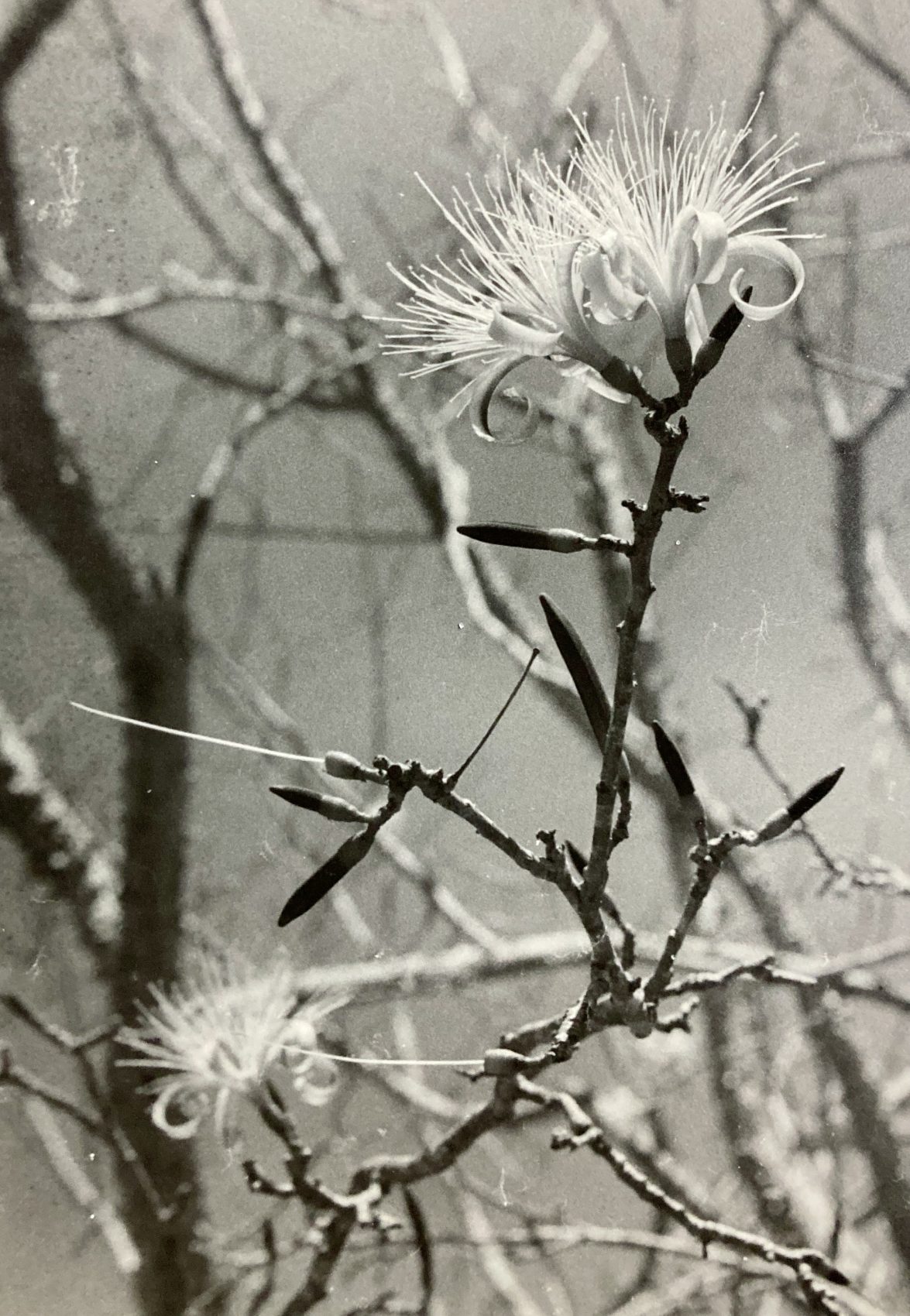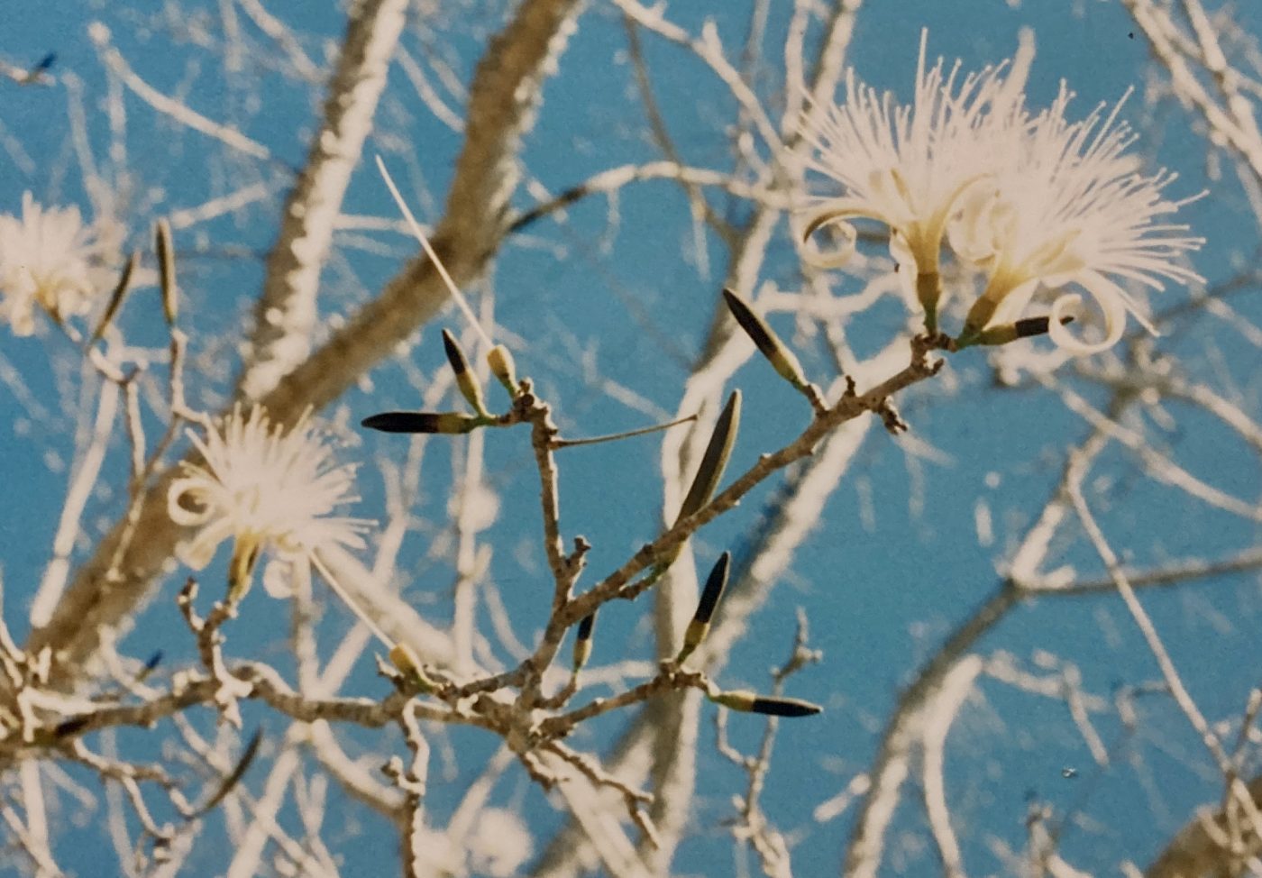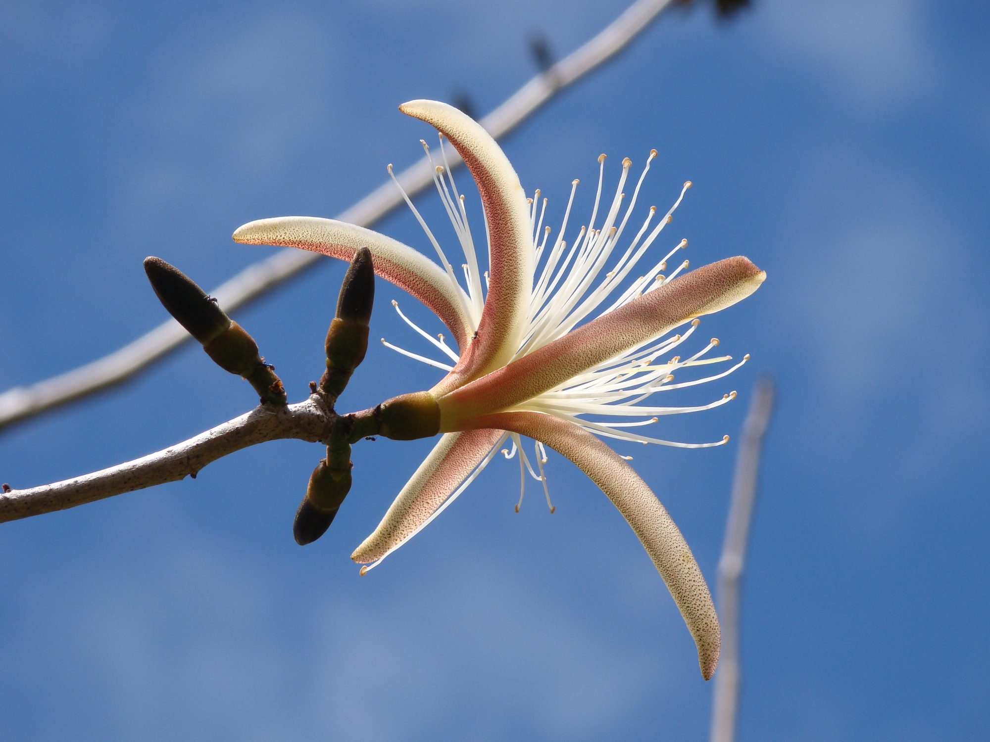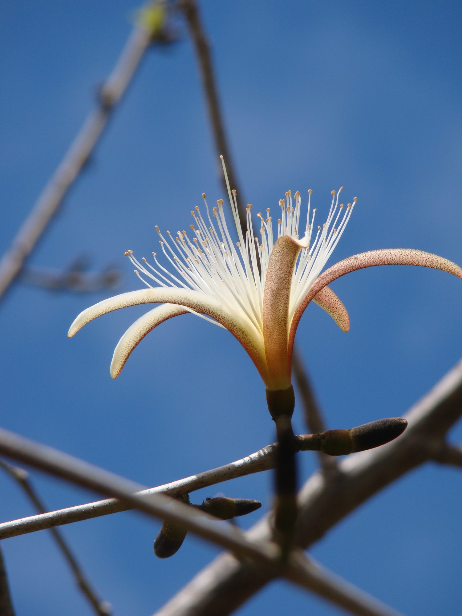 Ones the leaves are gone, torpedo-shaped flower buds begin to grow from leaf axils in small groups along the twigs. Each develops into a large blossom (10cm long by 12cm wide) with five, long, narrow petals emerging from a cup-shaped calyx. Though mostly white on their inner surfaces, the petals are finely speckled with reddish and brown outside. But the flower’s most eye-catching and notable feature are the abundant (upwards of 100), long stamens that populate the corolla along with the somewhat longer cental pistil. Flowers open at dusk and the corollas and stamens are shed during the course of the next morning. Spent and fallen blossoms dry out and then take on a deep red-orange color, adorning the ground as they accumulate under these trees. Flowering extends from January to early March.