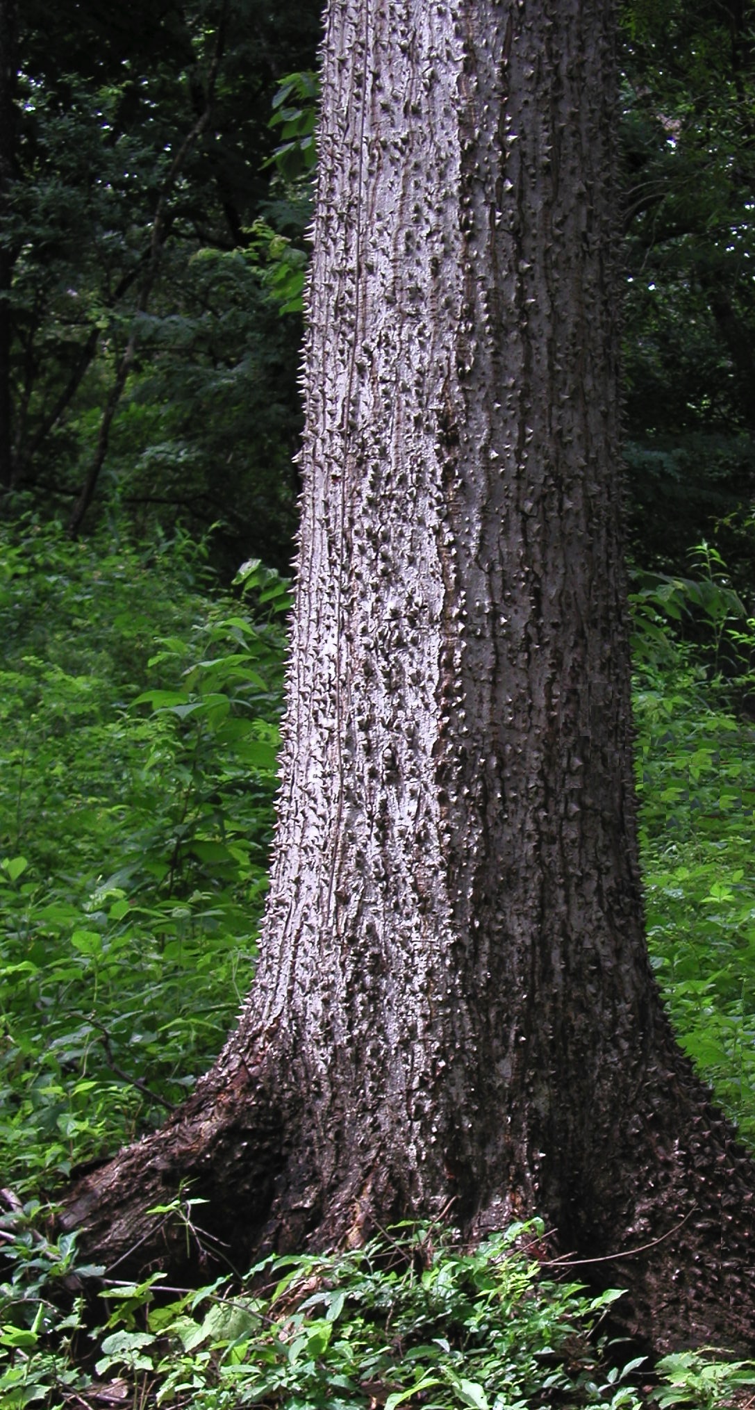 The purpose of the abundant thorns covering the tree’s trunk and branches is not clear. There does not appear to be any extant herbivore that might be deterred from consuming Pachote foliage by these sharp barbs, since no large herbivores climb trees and the smaller ones often live in the crowns themselves (i.e Howler Monkeys). It has been suggested that some component of the native American megafauna (that largely went extinct some 10,000 years ago) may have been the target of such a defense (e.g. Giant Ground Sloths).