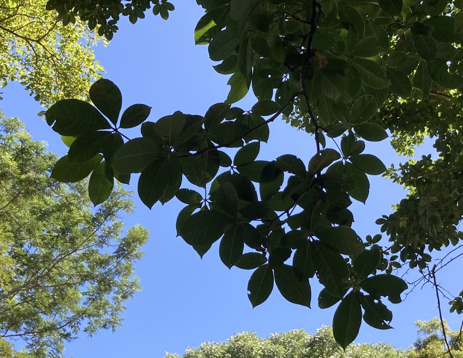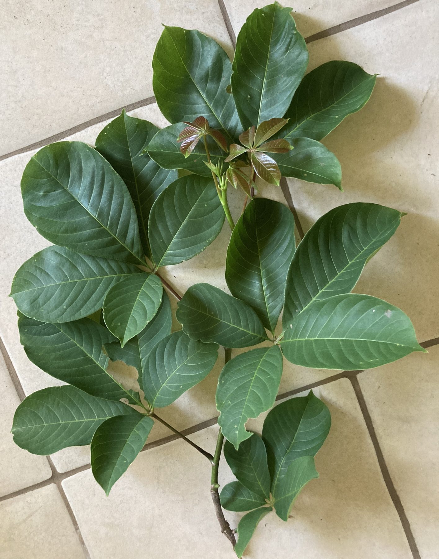 Pochote’s large leaves (27cm x26cm) are alternate and palmately compound, each consisting of five, unequal leaflets. The leaflets are elliptically-shaped, end in distinct drip tips, and become smaller with position approaching the petiole. The thin, papery foliage is shed rapidly at the very start of the dry season (late November – early December) and the trees remain bare until the rains resume (May).