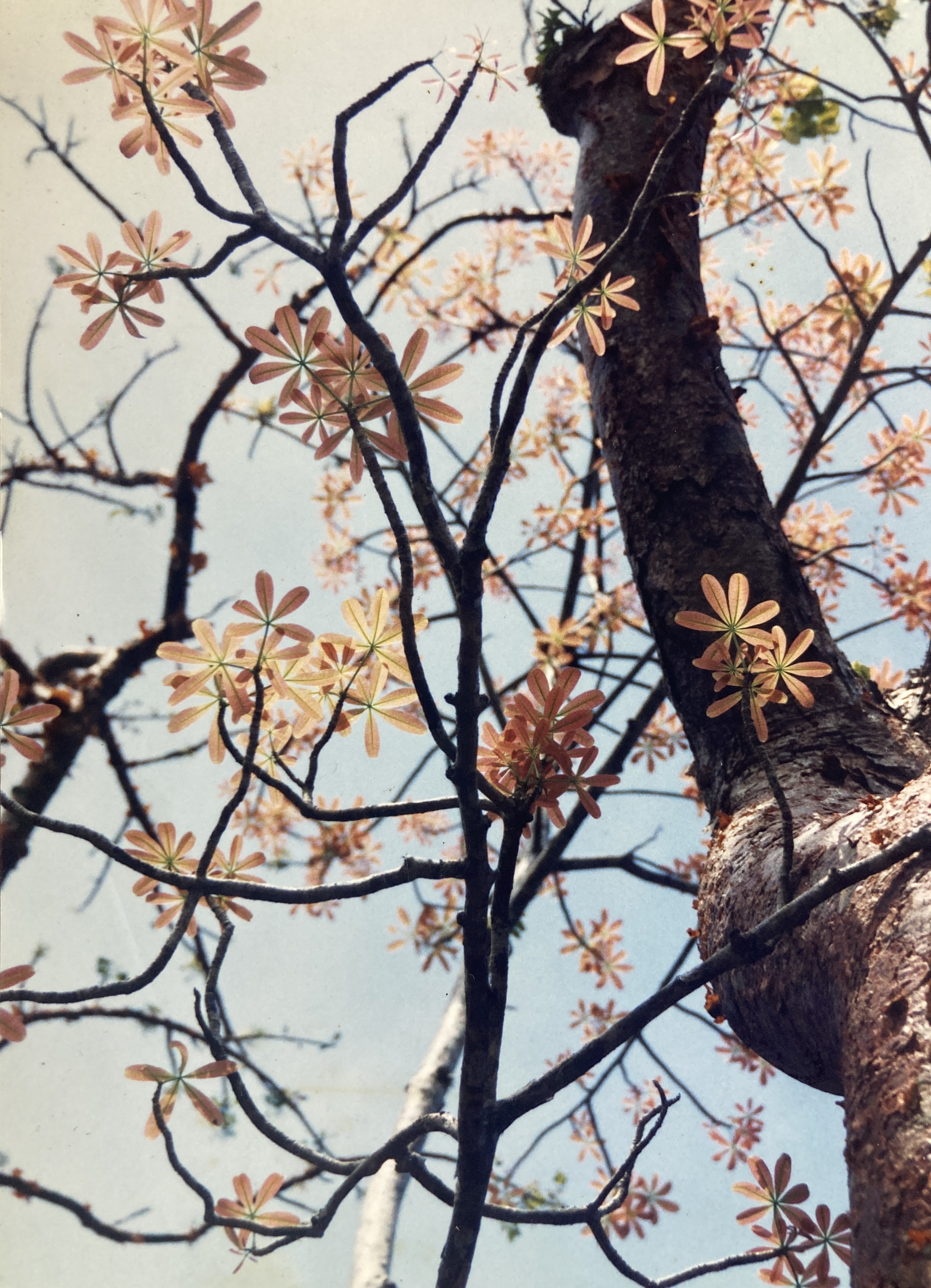 The foliage is made up of palmately compound, alternate leaves (23 cm long), each bearing approximately seven or eight leaflets at the end of a long petiole (9 cm). Leaflets are spatulate (wider distally and slowly tapering proximally), with obcordate (indented) apices and smooth surfaces. They are arranged in a circle around their common point of attachment to the petiole, forming an almost complete, though asymmetrical, disk of leaf tissue. Of variable size, distally placed leaflets are about twice as big (11 cm by 4 cm) as proximal ones (6 cm by 3 cm). Old leaves senesce and are shed during December and the trees remain bare until late February when leaf buds break and new foliage begins to expand. Emerging like so many small stars, the new leaves surround twig tips in a single horizontal plane. Still thin, and translucent, sunlight filters through the blades, making them glow with different pastel shades of pink, orange, and green. The aesthetic harmony of color, form, and arrangement is quite stunning. Trees are fully foliated by May.