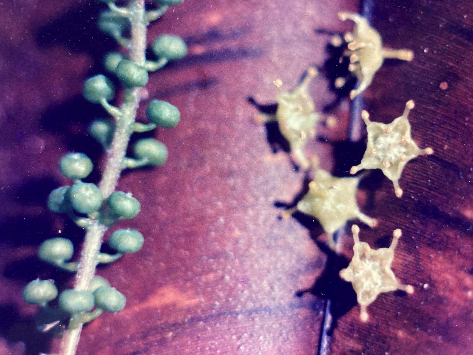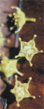 Simultaneous with, or slightly preceding leaf production, is the appearance of many stringy flower racemes. Each long, dangling raceme (14 cm) bears about 35 minute flowers (3 mm in diameter). The petal-less blossoms consist only of a yellow, star-shaped, five-point calyx, 10 short stamens, and a central pistil. Faintly aromatic, they emit a sweet and fruity fragrance. Buchenavia‘s annual flowering period is exceedingly brief, prolific, precisely timed (from season to season), and well synchronized. It occurs between late December and early January with individual trees maintaining open flowers for only about 10 days.