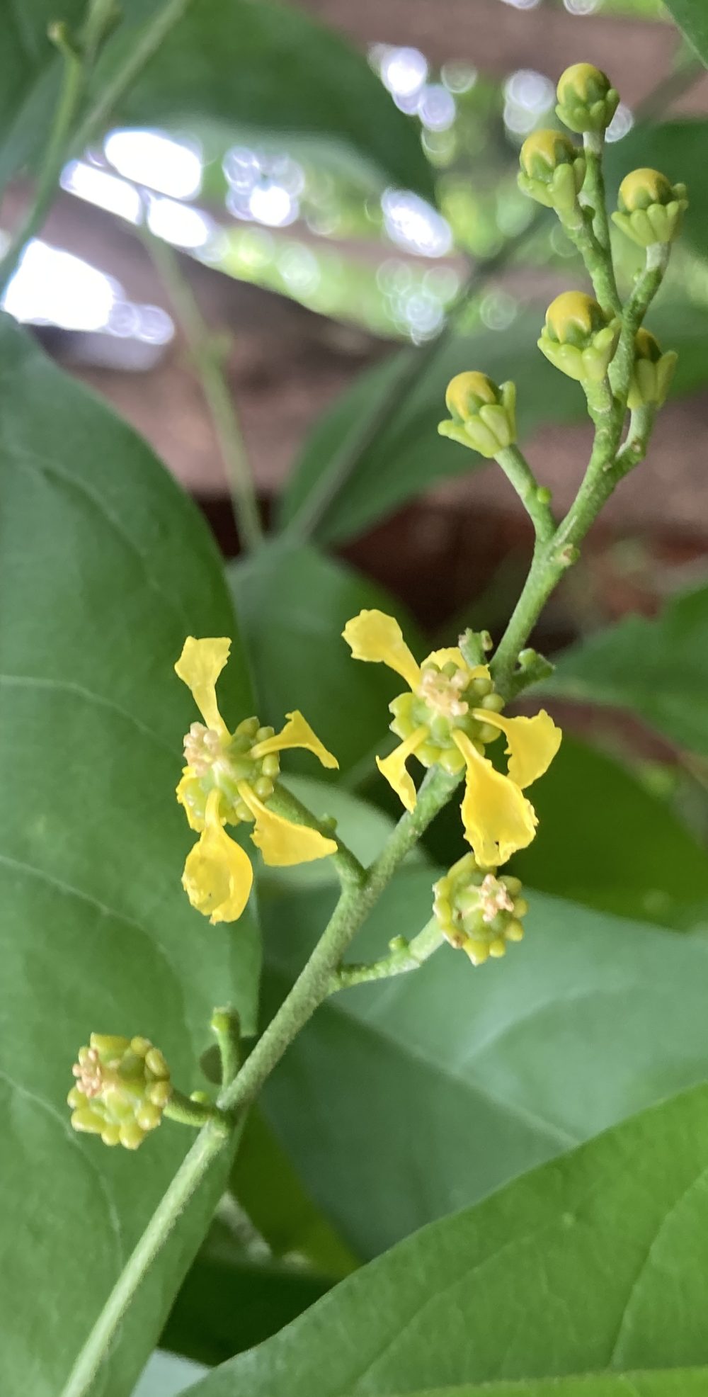 Flowers (1.5 cm) are bright yellow and produced in axillary racemes measuring 10 cm in length. Of typical Malpighiaceae form, each possesses five green sepals; five narrow, widely separated petals; a central cluster of large stamens. Cerezo sepals are dominated by paired, rectangular glands and these thick structures form a bowl-like ring around the base of the flower. Copious quantities of blossoms are generated annually and over an extended period that lasts from March through October, with a peak in May.