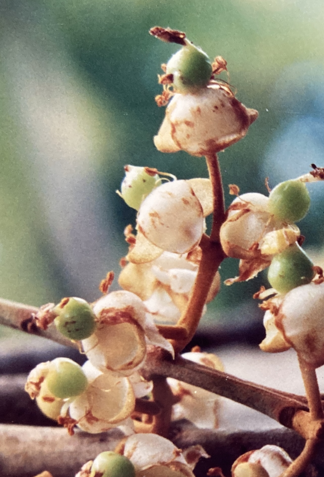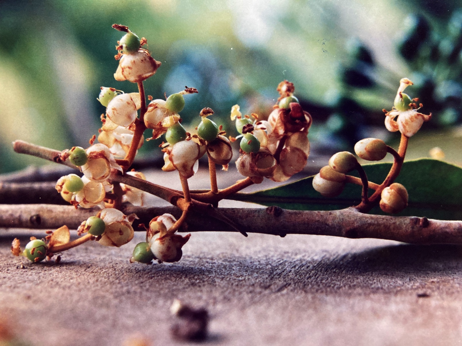 Fruits grow rapidly on female trees as the green ovaries expand, though their aborted, immature stages are found abundantly on the forest floor during all phases of their development. After about four months, the remaining fruits reach maturity. At this time they are large (4-5 cm), dull, blue-green drupes of globular shape. Only a thin layer of soft tissue covers the single, woody, round seed. Fruits ripen slowly and individually in the tree crowns, creating an extended harvest that may last for several months. This, combined with the semi-annual frequency of the flowering periods, creates a situation in which fruits may be encountered at almost any time during the year. In general, the only months lacking harvest activity are those from June to September. María seeds germinate only after remaining dormant for several months in the most soil. Frequently, accumulations of seeds that have built up over the summer months germinate simultaneously with the return of the rains in May and June.