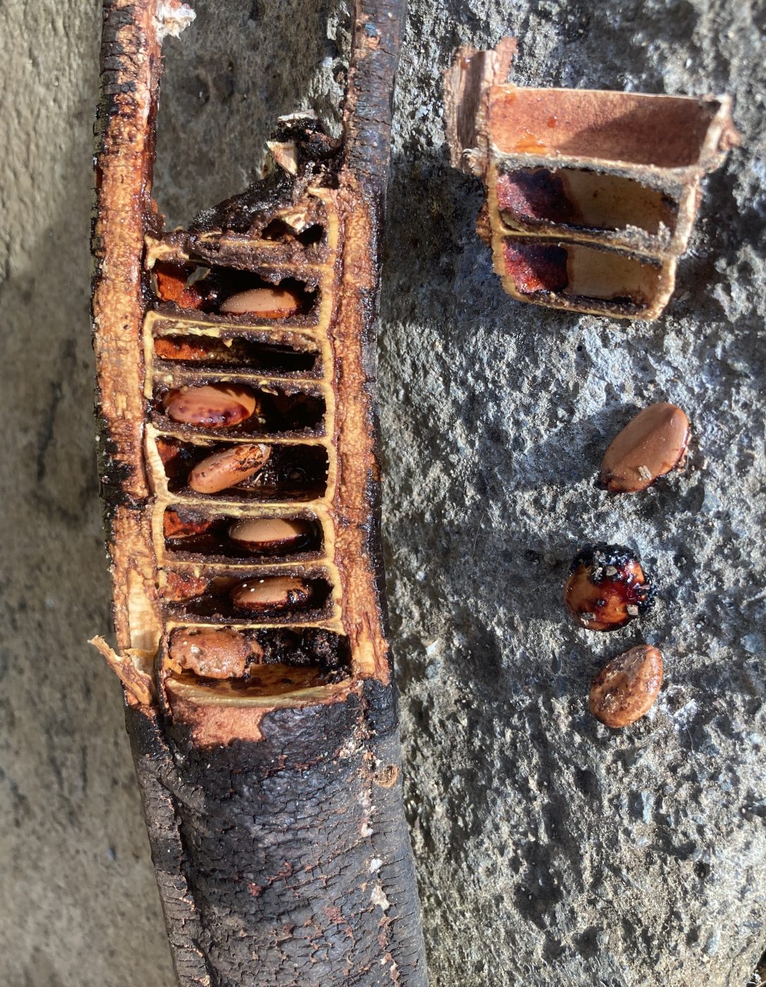 As suggested in the description above, Carao seeds and compartments are oriented at right angles to the main longitudinal axis of the pod – (i.e. transversely). This design, along with the large, curved pistil of the flower, are unique and identifying characteristics of the large (pantropically distributed) Cassia genus.