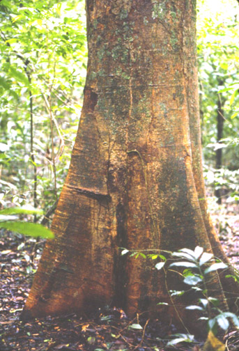 Description: Camíbar has a mostly cylindrical, straight and columnar trunk (exceeding 1.2 m in diameter in large individuals), occasionally possessing stout, low, rounded buttresses. High above the surrounding forest, the bole supports thick limbs that give way to a multitude of fine twigs, forming a wide, hemispherical or flattened crown. A nearly continuous shell of fine leaflets, arranged in a single, tenuous layer, complete the open Camíbar canopy. Distinctively reddish or orange in color, Camíbar bark is relatively smooth and it makes this tree stand out from surrounding vegetation. In the oldest and largest specimens (>1 m), the bark on the lower bole becomes gray, rough, and vertically fissured, as the outer, smoother cortex is shed in thick, rectangur strips. Camíbar has very characteristic and memorable leaves (20 cm by 9 cm) that allow its rapid identification. Each is compound, paripinnate, alternate, and made up of eight to twelve asymmetrical leaflets. The leaflets (6 cm by 2.5 cm) are elliptical but strongly falcate (forward-curving) in shape, tapering to a sharp drip-tips. Some amount of leaf-folding is evident in this species at night. Trees shed and then regenerate their entire crown of foliage sometime between late January and May, remaining bare only briefly.