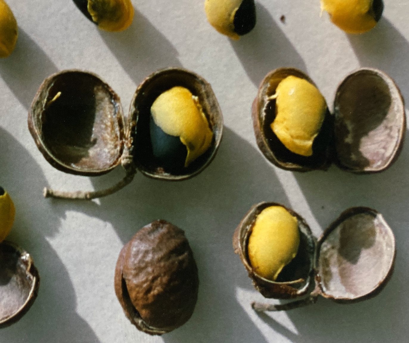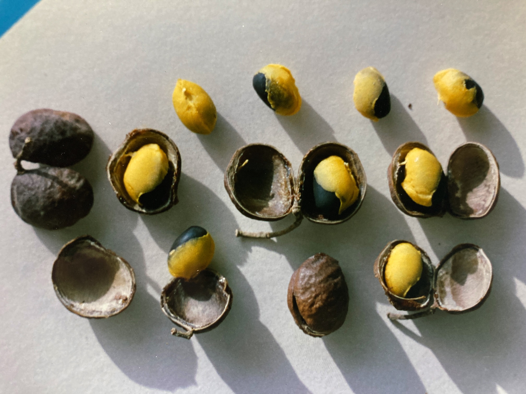 The fruit (3.5 cm) is a coin-shaped, dehiscent woody pod with a central bulge. Splitting longitudinally, each reveals a bright yellow aril that covers three-quarters of a single, round, glossy black seed (1.5 cm). Also within the pod is a small amount of thick, clear, odorous resin – smelling strongly of camphor. During their development, large quantities of immature fruits are usually aborted and can be found on the ground beneath Camíbar crowns. Harvests occur over the course of about a month, sometime between November and March. These variably timed and unsynchronized events do not occur annually, with individual trees producing large harvests every three or four years. Seeds germinate at the beginning of the next rainy season.