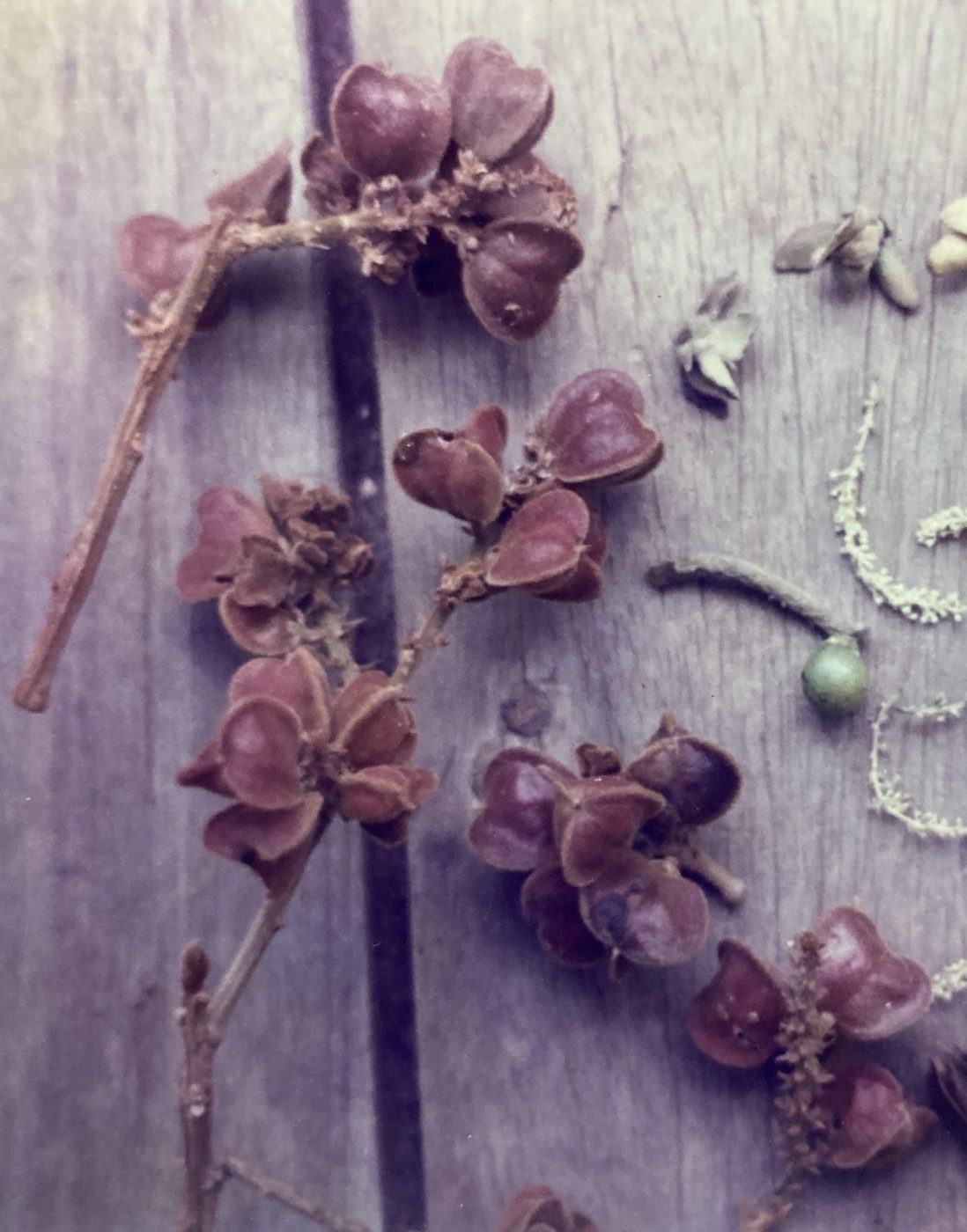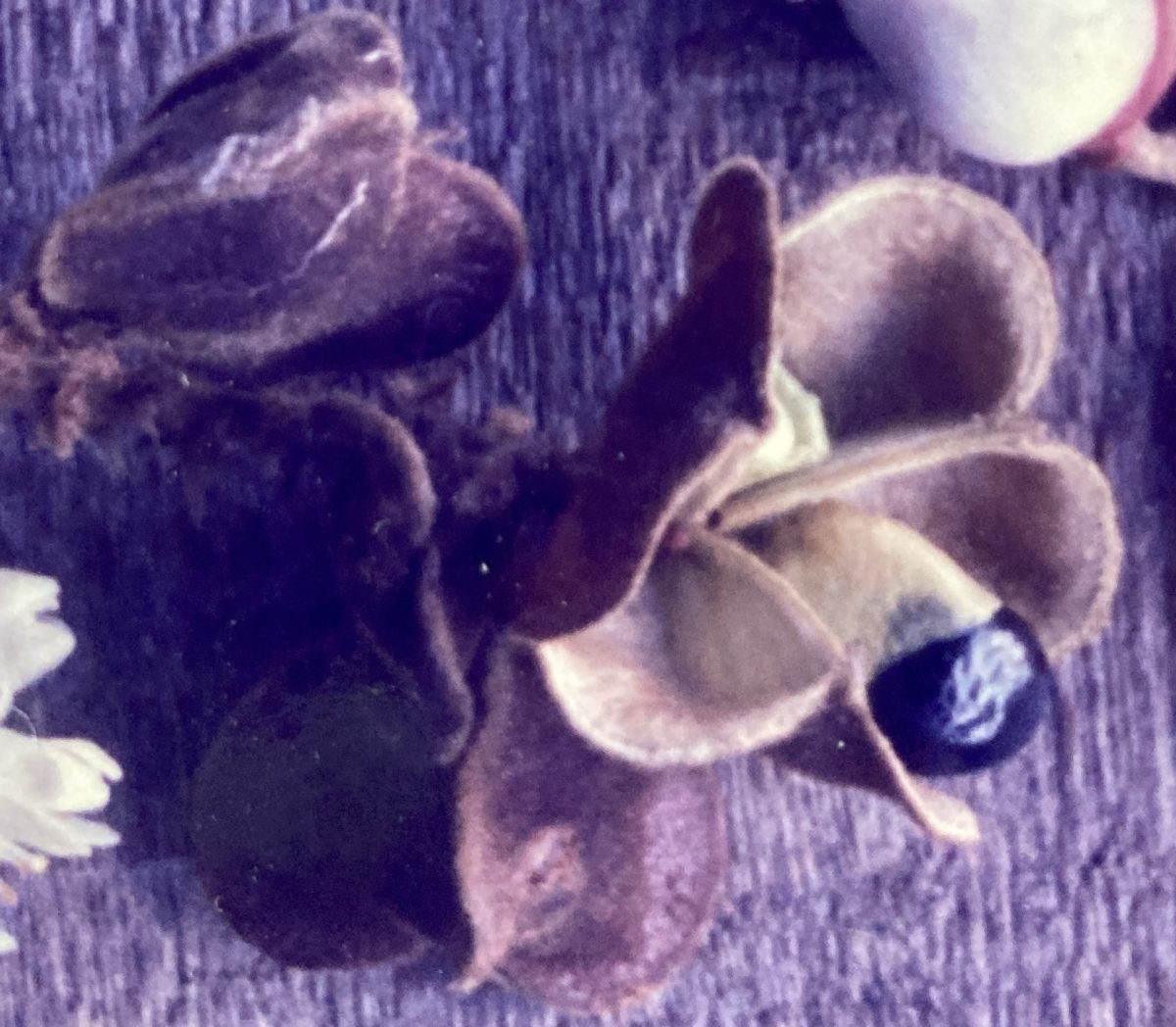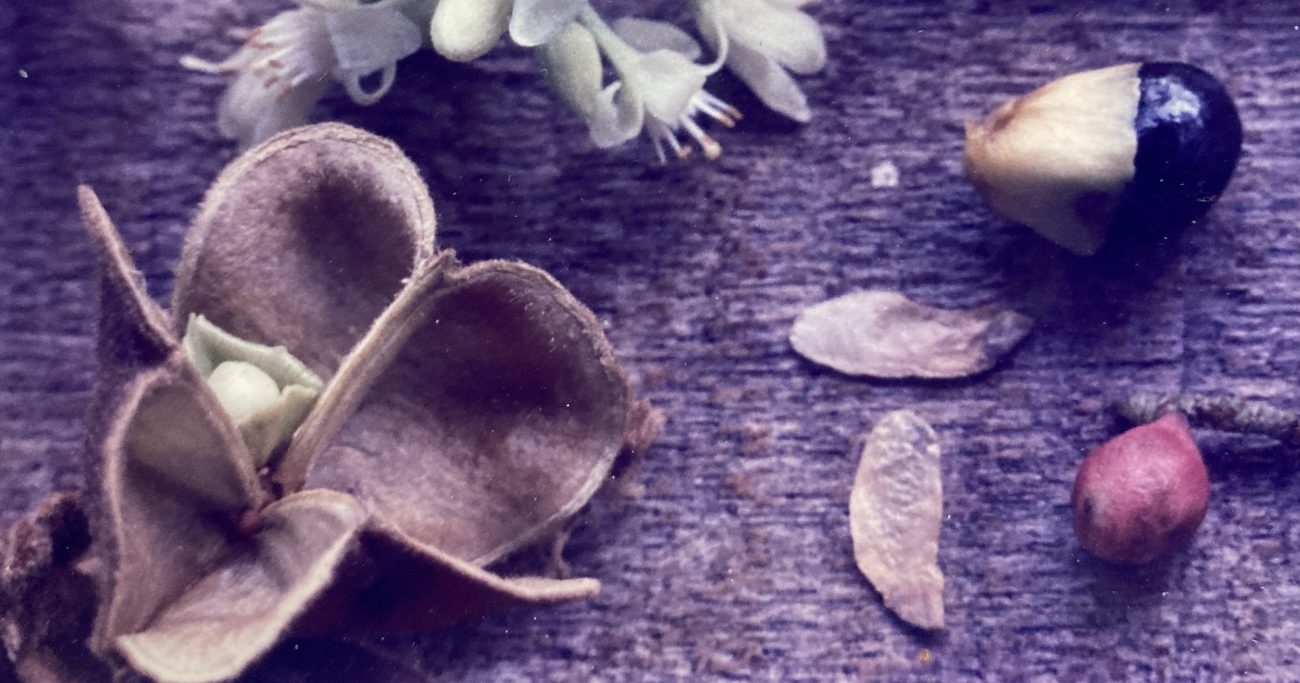 By April, angular, dehiscent, three-part fruit capsules are visible at the ends of the panicle spikes. Held above and away from the surrounding foliage, they are clearly visible to foraging avifauna. Mature pods (2.5 cm in diameter) have a thin, bark-like texture and a marked red-maroon tinge. Inside, popcorn-kernel-shaped, glossy black seeds (0.8 cm) lie half-concealed by a thin, yellow aril. Harvests last from May through early June, as the capsules slowly open and release their contents.
