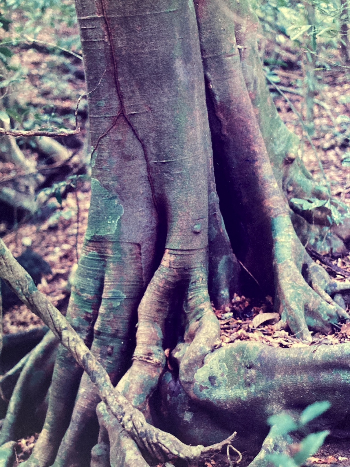 Description: Guapinol Negro has a cylindrical, straight trunk (to 1 m) that gradually divides into a myriad of successively smaller branches and fine twigs. The twigs support a dense population of leaves, both inside and on the outer fringes of the canopy, producing a thick, impenetrable, and rounded crown. The lower two meters of the bole are dominated by long, thin, buttresses that disappear into the ground after subdividing and snaking around the base of the tree. Guapinol bark is smooth, gray-brown in color, and slightly exfoliating. Large quantities of multicolored lichens further mottle the bark with unexpected colors and patterns.