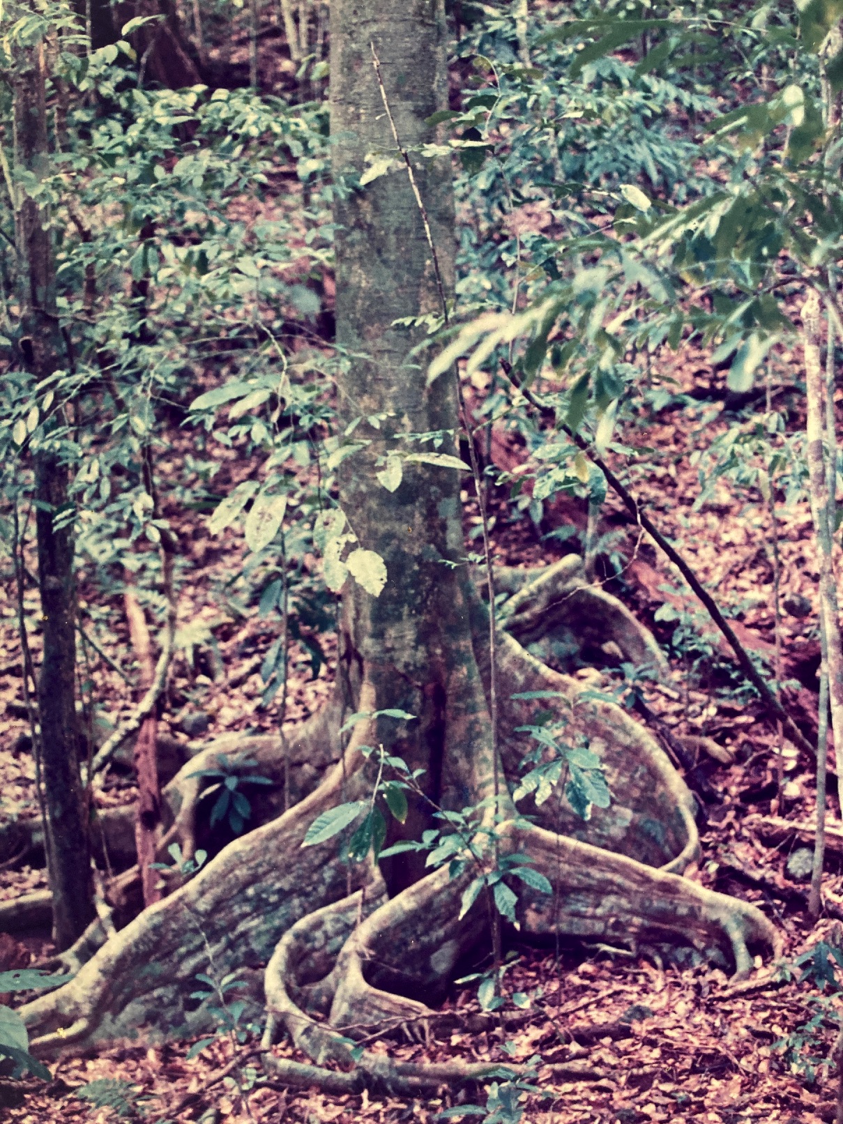 Description: Guapinol Negro has a cylindrical, straight trunk (to 1 m) that gradually divides into a myriad of successively smaller branches and fine twigs. The twigs support a dense population of leaves, both inside and on the outer fringes of the canopy, producing a thick, impenetrable, and rounded crown. The lower two meters of the bole are dominated by long, thin, buttresses that disappear into the ground after subdividing and snaking around the base of the tree. Guapinol bark is smooth, gray-brown in color, and slightly exfoliating. Large quantities of multicolored lichens further mottle the bark with unexpected colors and patterns.