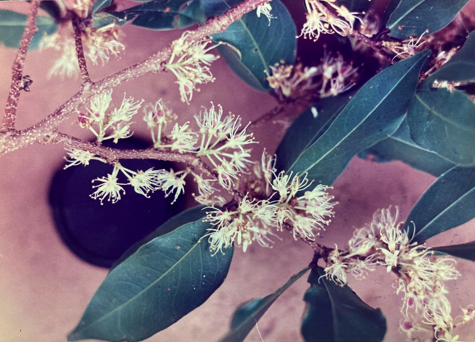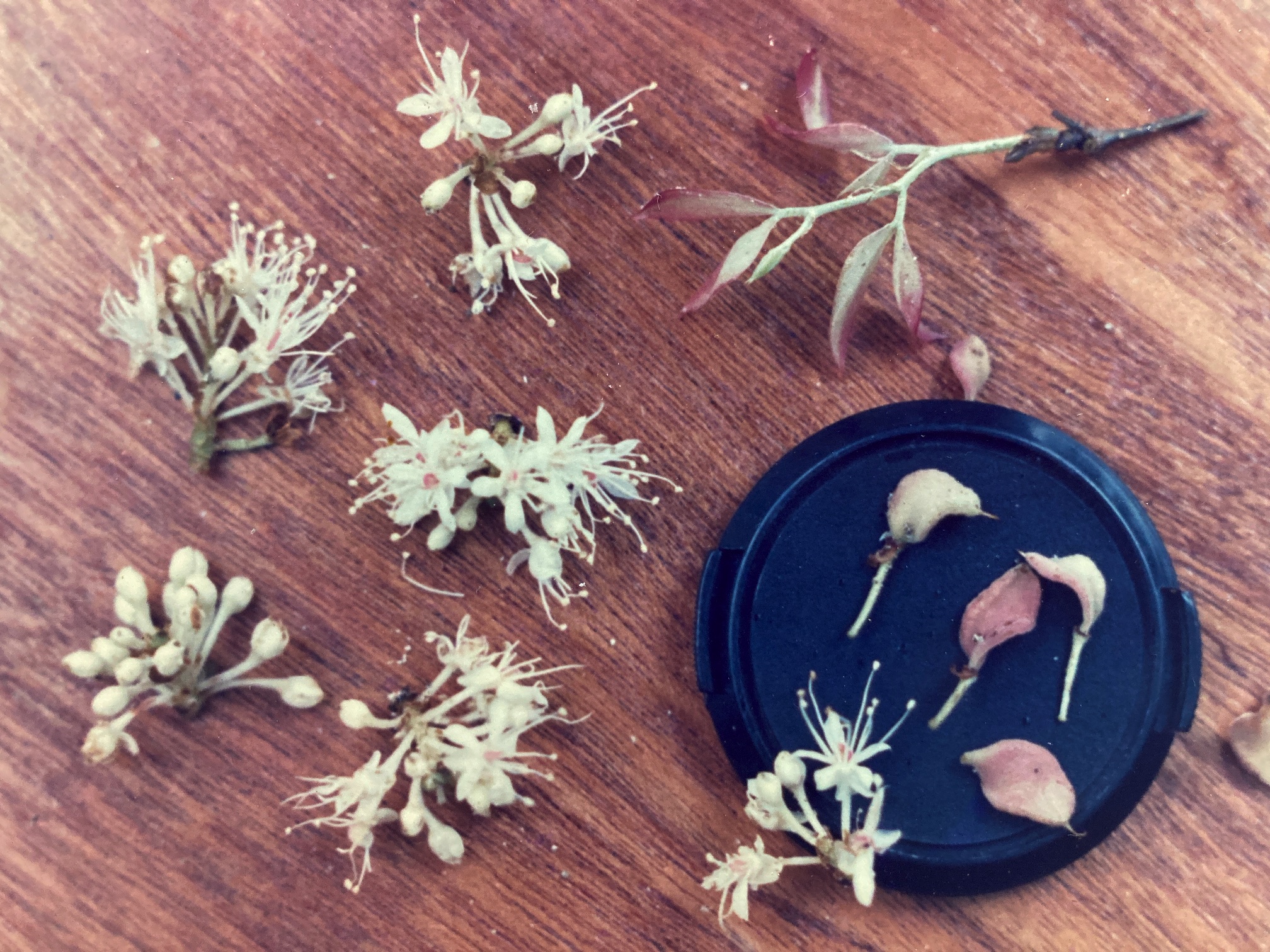 Flowers (1.5 cm) are white with a prominent and flattened pink pistil, five petals, and eight long stamens. Smelling aromatically of the tropical Manzana de Agua fruit, they occur in short axillary racemes. The annual flowering season is short and occurs for about one week during July. Very often, trees limit their flowering activity to specific limbs – the majority of the tree remaining sterile. On rare, impressive occasions, the event is well choreographed and blossoms envelope the crowns of all trees simultaneously, creating a short-lived, but highly synchronized display. Under such circumstances, a continuous rain of fine flower petals fills the air and eventually blankets the ground.