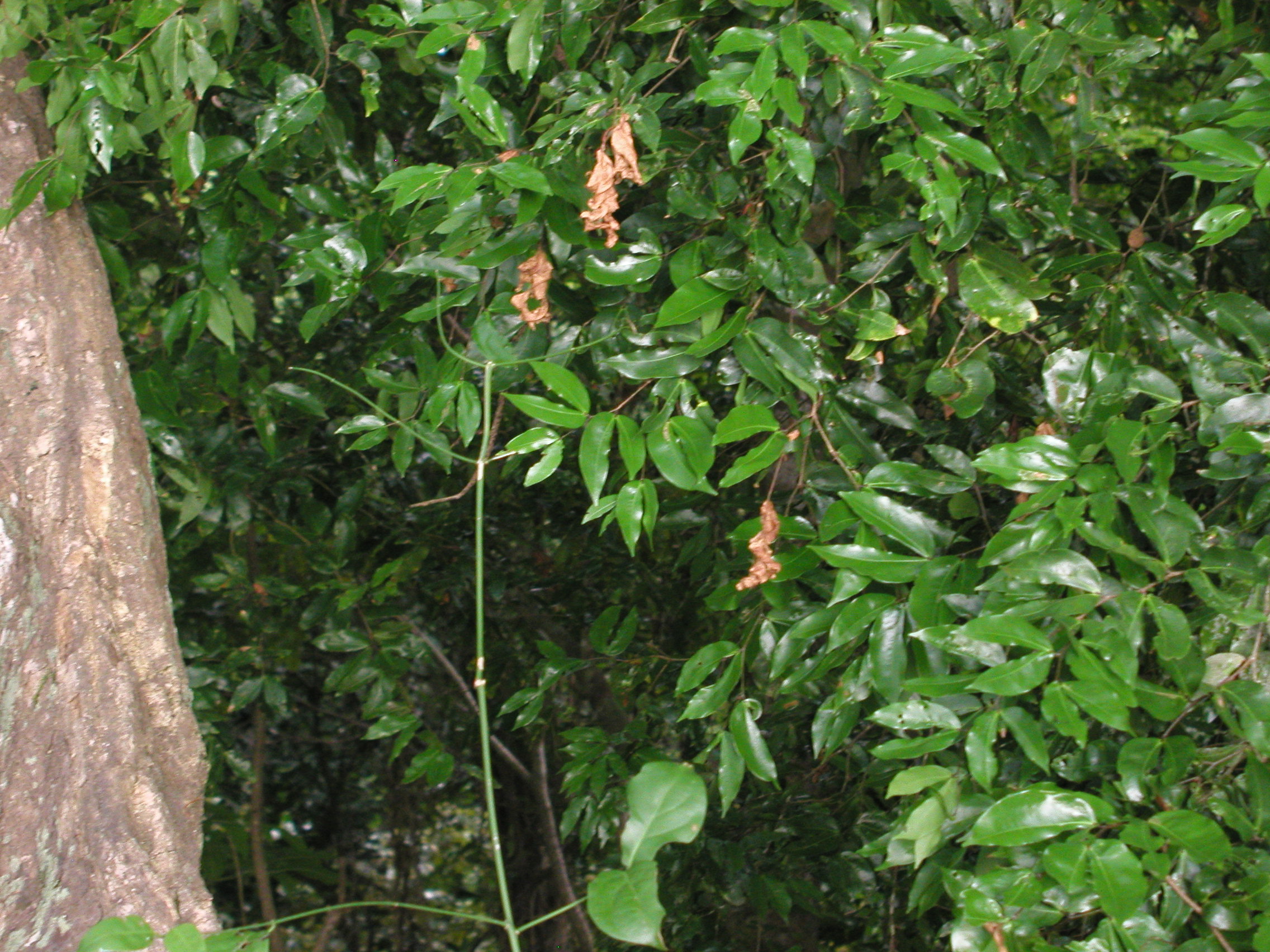 Natural History: Cynometra flowers are visited by a wide variety of insects, including bees and butterflies. Leaf-cutter ants use the flowers for their fungus farms, sometimes traveling far up and down the boles of trees to harvest them. Mysteriously, Guapinol Negro fruits do not appear to have any effective means of dispersal (they lack any structures that could otherwise be construed as edible tissues, wings, barbs, etc.). It is possible that these woody pods are transported by water: Cynometra trees are often situated near streams and the buoyant pods could float to new locations downstream. Indeed, ocean dispersal could also help to explain this tree’s extreme abundance along Manuel Antonio’s sandy coastline. Nevertheless, water dispersal fails to account for Cynometra‘s presence in the dry, forest interior.