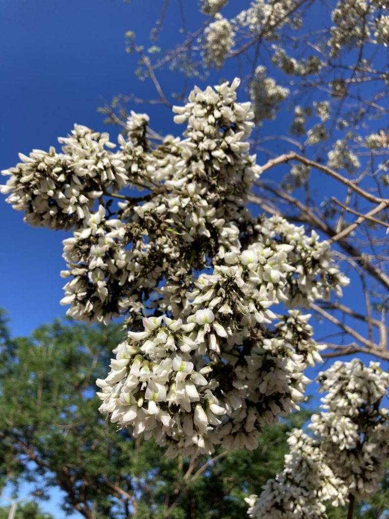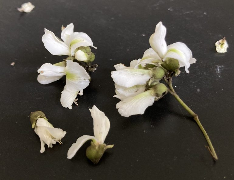 Flowers (1 cm) are produced in large axillary panicles (about 20 cm long or more) holding a hundred or so of the irregular, white blossoms. Resembling pea flowers, each has five unequal petals; a cup-shaped, fused green calyx; ten stamens; and a green central pistil. A large, superior petal, sporting a pale green spot at its center, forms a wide hood over the remaining, narrow, inferior petals. Flowering immediately precedes leaf generation, and occurs in March or April.
