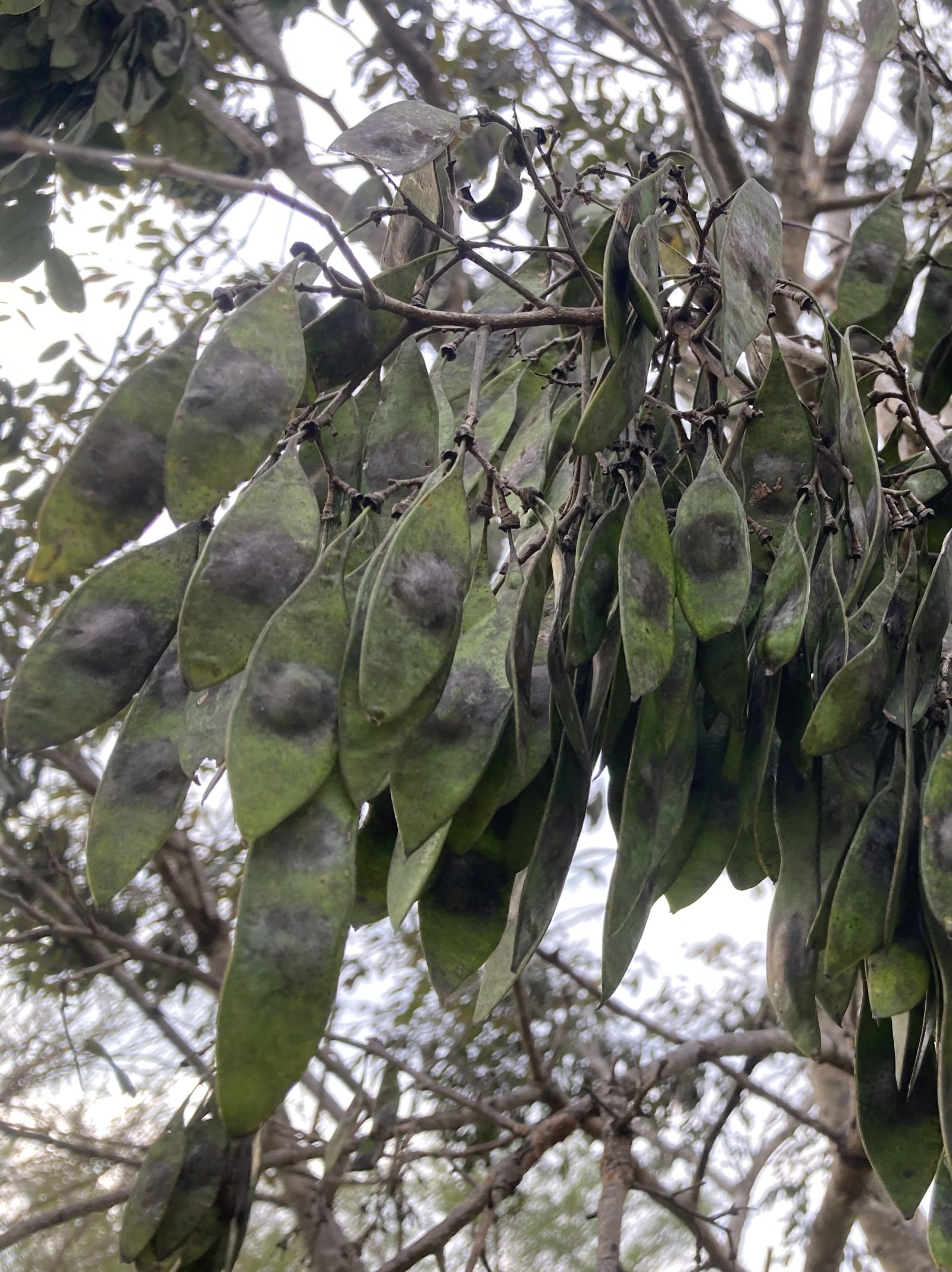 Cocobolo fruits (15cm x 3cm) grow rapidly from the green pistils and reach full size as flat, narrow, green papery pods. Each contains from one to three this seeds that germinate readily when moistened. The pods persist in the crown for months, eventually during brown and getting pulled off the tree by the strong winds of the dry season.