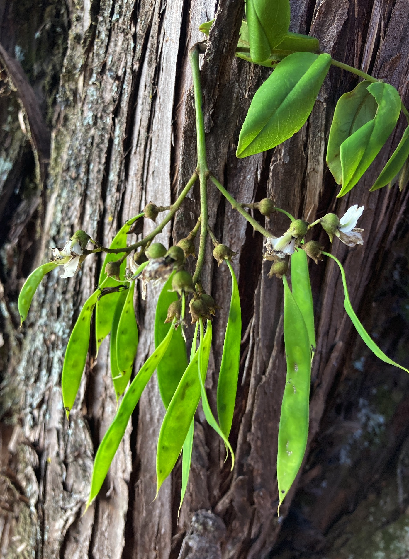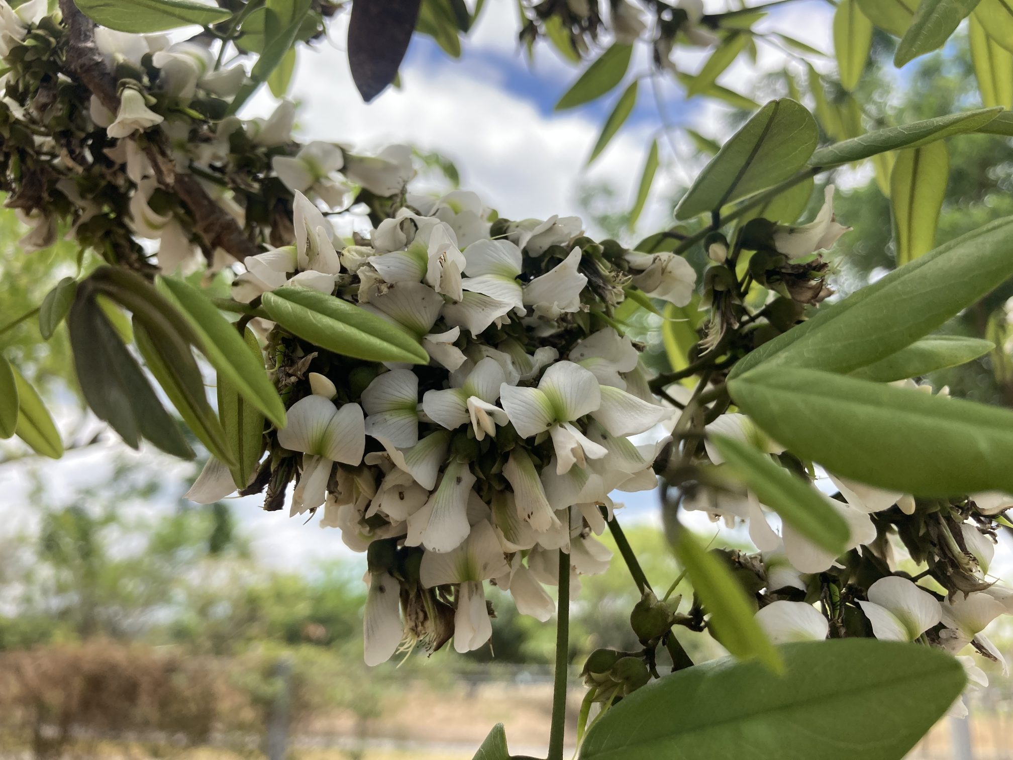 Flowers (1 cm) are produced in large axillary panicles (about 20 cm long or more) holding a hundred or so of the irregular, white blossoms. Resembling pea flowers, each has five unequal petals; a cup-shaped, fused green calyx; ten stamens; and a green central pistil. A large, superior petal, sporting a pale green spot at its center, forms a wide hood over the remaining, narrow, inferior petals. Flowering immediately precedes leaf generation, and occurs in March or April.