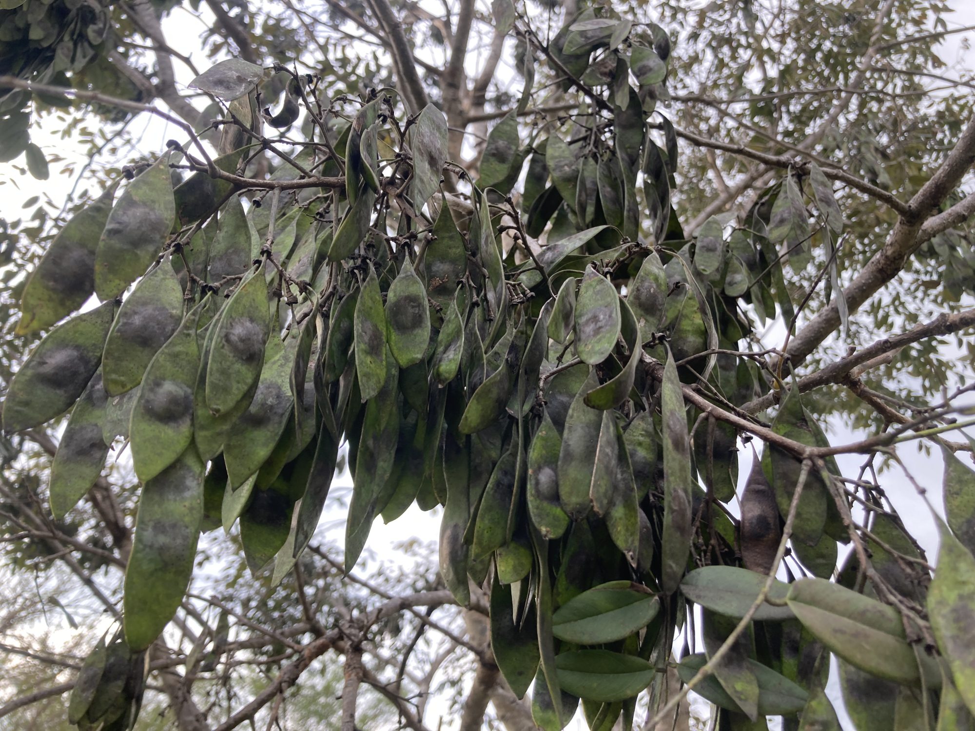 Cocobolo fruits (15cm x 3cm) grow rapidly from the green pistils and reach full size as flat, narrow, green papery pods. Each contains from one to three this seeds that germinate readily when moistened. The pods persist in the crown for months, eventually during brown and getting pulled off the tree by the strong winds of the dry season.