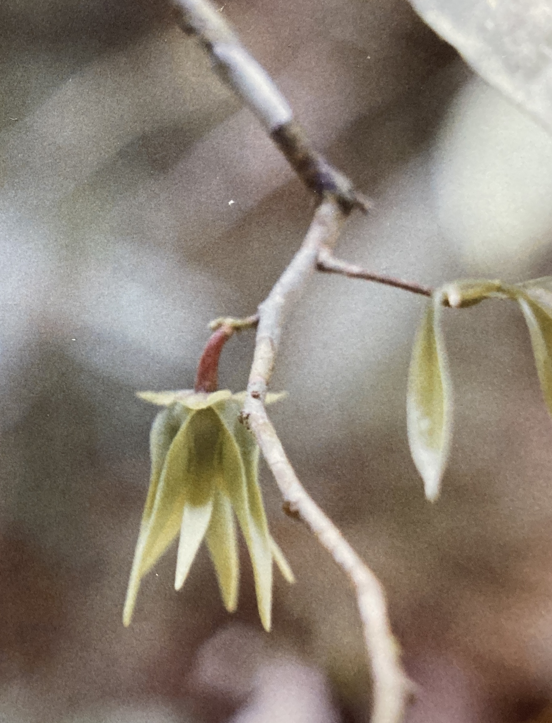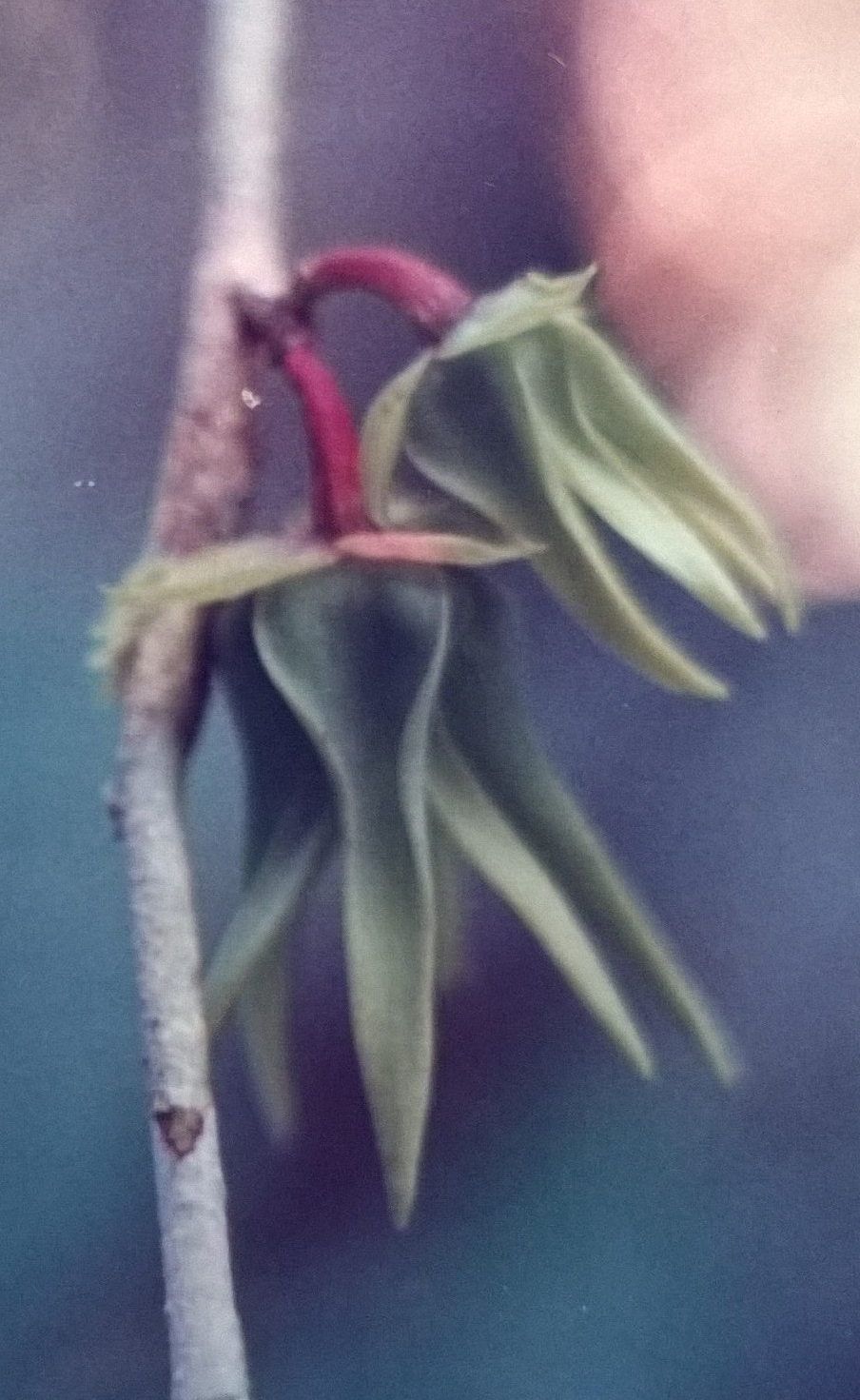 Flower buds – really just green, miniature versions of the mature blossoms – become visible in the same month, emerging from leaf axils and along the leafless portions of the branches from old leaf scars. Each adult flower is composed of a vertically hanging collection of yellow, spike-like petals capped by a red, three-part calyx and pedestal. Measuring 5 cm in length, the six petals (each strongly curled about a longitudinal axis) are splayed outwards at the bottom of the blossom. Deep inside this complex corolla lie six short stamens that are attached to the top of a fat, central pistil. Blossoms emit a faint, banana-like odor. Flowering occurs from September through October with a secondary event often observed in January and February.