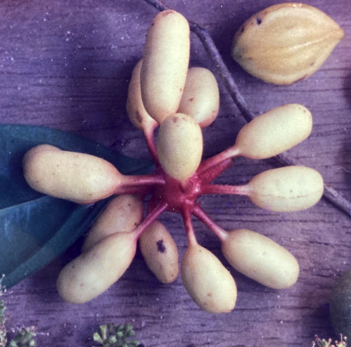 Fruits, resembling spiked balls (8 cm), begin to grow immediately, reaching maturity after about two months. Initially, they appear as a cluster of rice-sized grains attached to the end of the flower ovary. Later, these grains spread apart and enlarge into approximately twelve, yellow, club-shaped appendages that radiate outward from the swollen, red hub that serves as their common place of attachment. Each fleshy club contains about five, longitudinally stacked brown seeds. Disk shaped, the seeds (6 mm) are circumscribed by prominent, lateral grooves. Fruits mature in December and, to a lesser extent, in May.