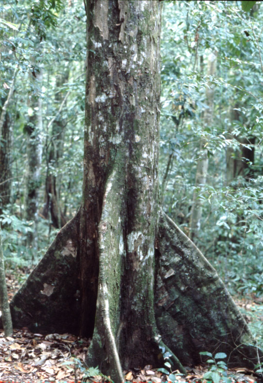 The long stalks that support the flower and fruit panicles are flexible and quite tough, allowing these important structures to be maintained in positions of high visibility to potential pollinators and seed-dispersers without risk of breakage due to wind exposure or the excess weight of clinging animals. Buttress roots, in Papallo as well as other tropical trees, probably evolved as extra support structures. Thanks to the paucity of nutrients found in the deeper layers of many tropical soils, arboreal root systems often tend to be shallow. The fin-like buttresses then widen the base of the tree, adding stability in the absence of deeply anchoring tap roots.