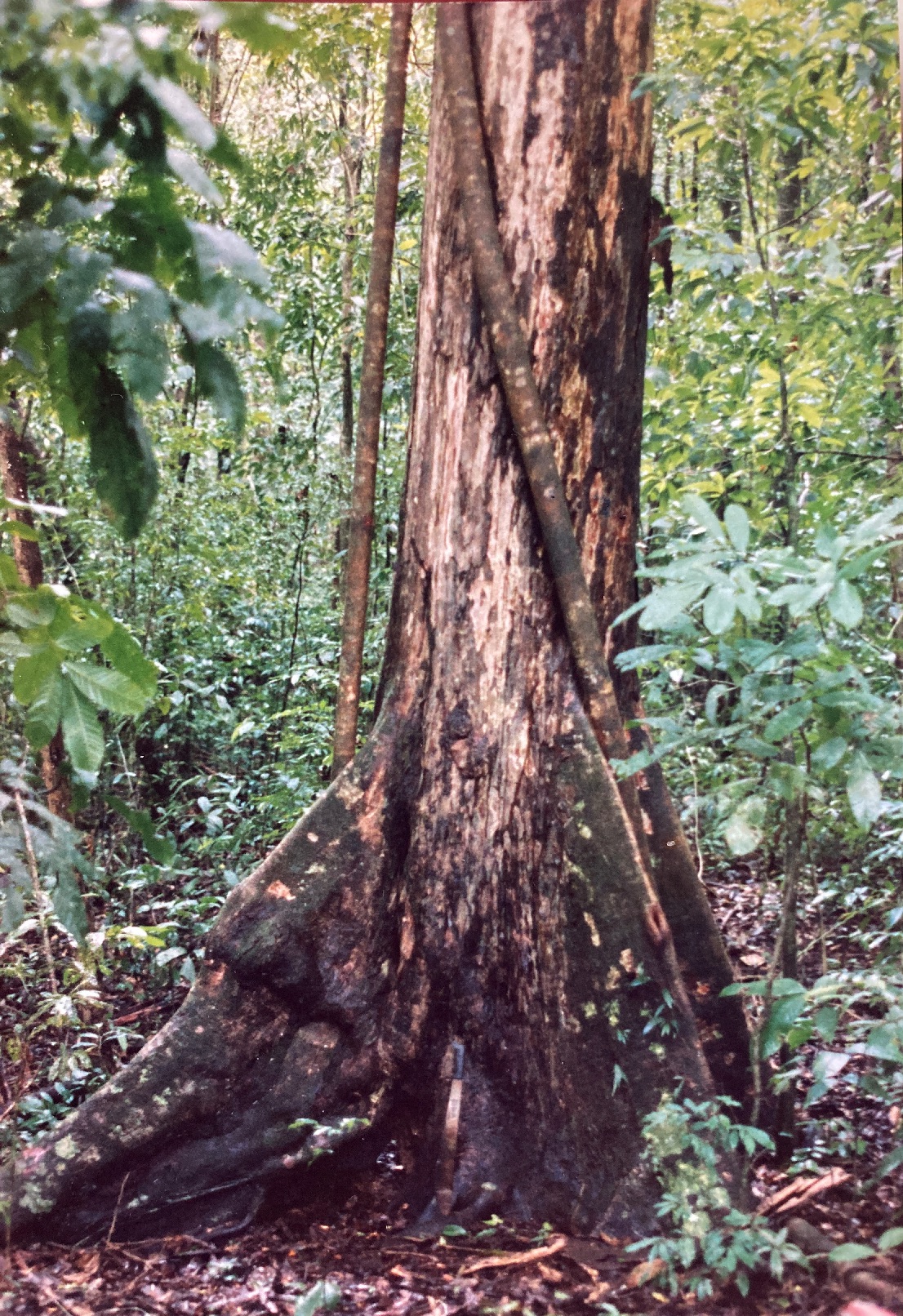 Description: The trunk of this imposing tree grows to be over a meter in diameter. Rising through the dark forest understory, the bole is cylindrical and straight – appearing as a mighty column erected to support the vaulted jungle roof high above. Very prominent, abrupt, thin, and extended buttresses emerge from the trunk about 2 meters above the forest floor and enter the soil about the same distance from its base. In size, shape, and relation to the main trunk, they often resemble the stabilizing fins of a rocket. Papallo bark is mottled with varying shades of brown and gray, with lighter areas representing younger bark exposed when older pieces fell away. Exfoliation is an important process in this species and it occurs in characteristic, irregularly shaped – often scalloped – sections. Dark green and off-white tones are often present on tree’s outer cortex as well, caused by the colonies of moss and lichens that grow there. Finally, the bark is tough and fibrous (difficult to cut through) and covered with elevated point lenticels. Clear, strong-smelling, resinous sap is abundantly found in all plant parts. Papallo boles sustain thick limbs high above the ground, and they extend horizontally for many meters, producing a wide, umbrella shaped crown of moderate thickness.