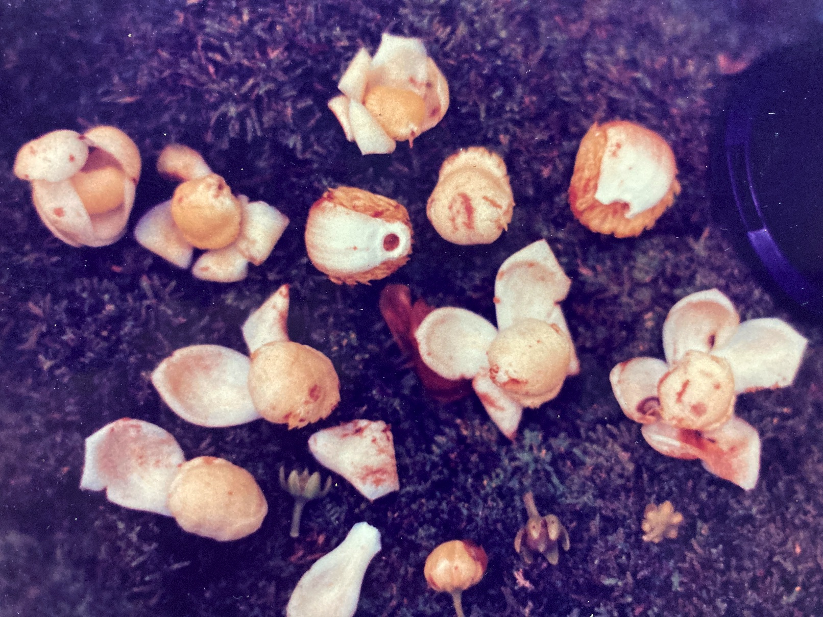 Fruits expand rapidly from the ovary after fertilization, and many are aborted while still small. Soon, the crop stabilizes as the fruits develop into large (4.5 cm), woody capsules. With a deep, bowl-shaped base and a thick, pointed lid or cap, each fruit is olive green and speckled with rust-colored lenticels. When mature, the capsules shed their lids while still in the trees, revealing from one to four (usually two) dark brown, waxy, and essentially globular (they may possess flat surfaces) seeds (2 cm). Each seed is further decorated by a prominent network of white veins that run across its glossy surface. In the pod, these seeds are partially covered by a pungently odorous, (garlic-like) fleshy, white aril that is foraged by forest animals. Seeds eventually fall to the ground where they germinate in the moist soil within 2-3 weeks – if they are not first eaten by ground-dwelling mammals. The old woody capsules are also shed and they persist under the trees, intact, for as long as several years. Large harvests are basically annual events, with occasional seasons seeing only limited and sporadic fruiting activity. Crops mature in July and August.