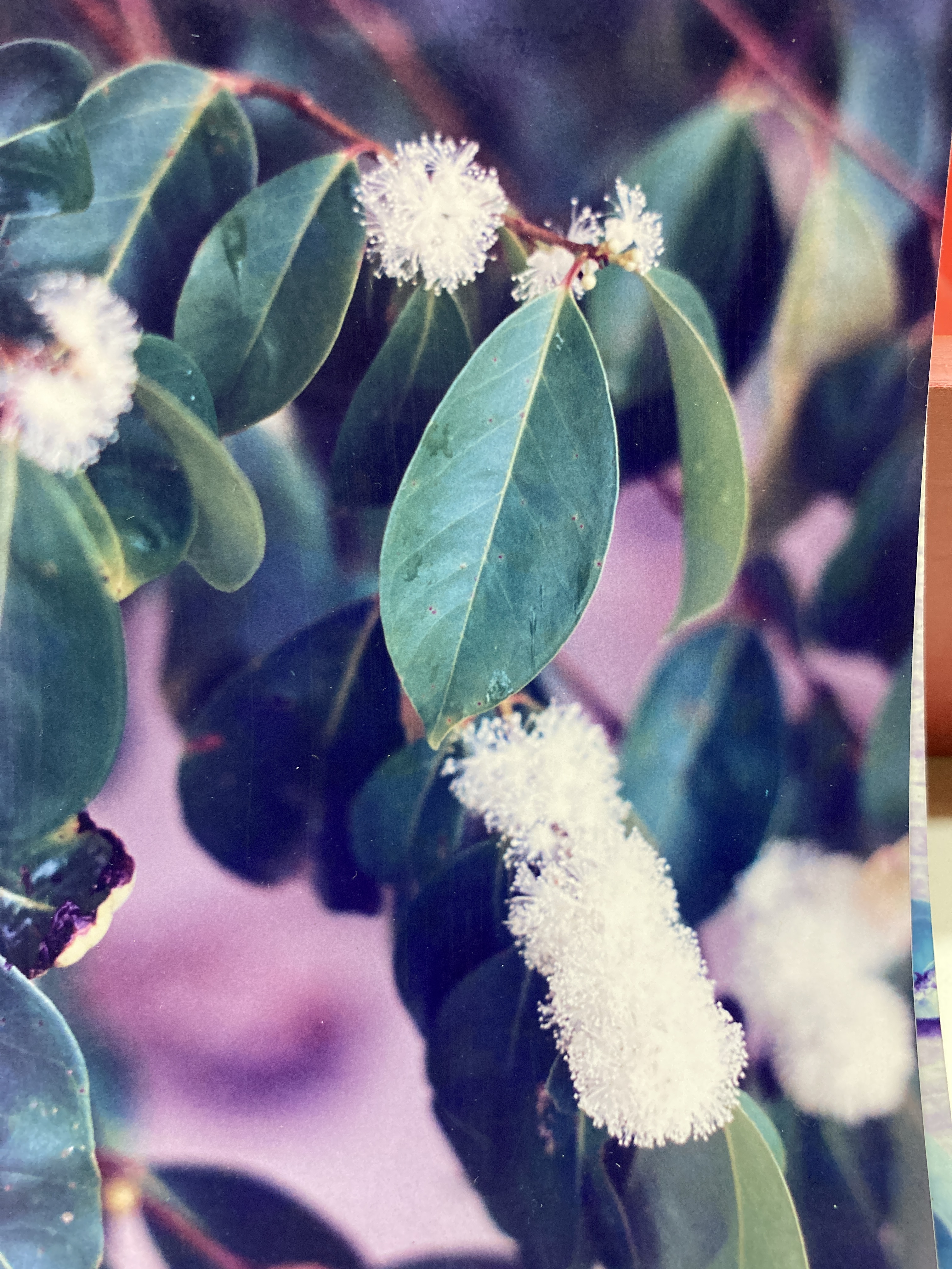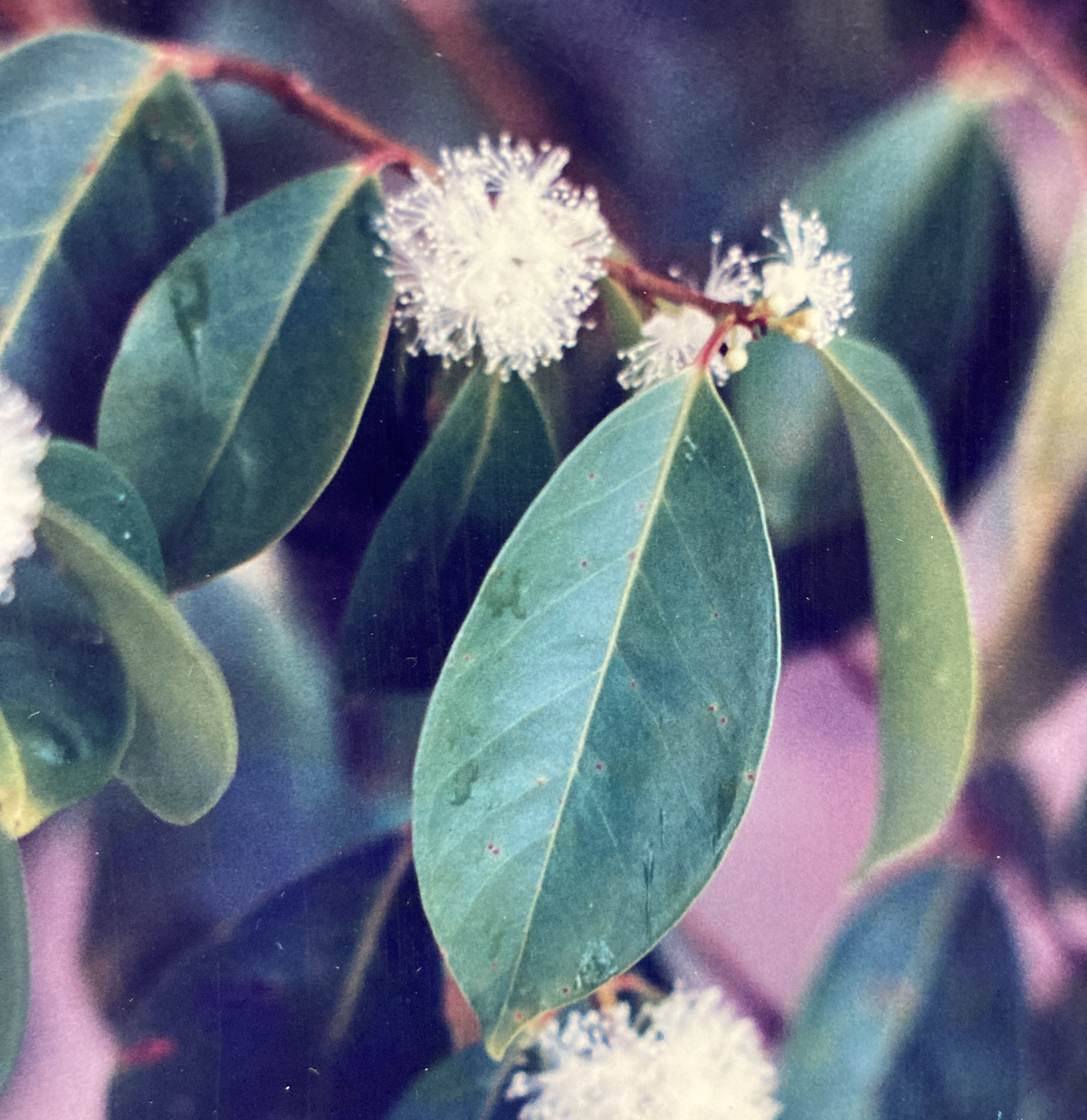 Description: Murta has an slightly angular trunk that, although not columnar, is nevertheless vertical and mostly straight. The bole is often grooved or creased and its cross-section diverges strongly from a uniform circle. Perhaps due to the tree’s small girth and stature (the largest specimens have diameters of only 30 cm), buttresses are lacking. Murta has gray to light brown bark that is vertically fissured and exfoliates in thin, narrow strips. Branches cover the upper two thirds of the bole, though the crown they produce is thin, open and airy. Leaves (9 by 6 cm) are simple and opposite (typical of the Myrtaceae). Supported by 1 cm petioles, the blades are widely elliptical and they possess moderately developed drip-tips. A single, prominent mid-rib is evident, impressed into the lamina’s light green, waxy surface; while secondary veins remain inconspicuous. An annual growth spurt, involving the production of new foliage, generally occurs late in the year: sometime between September and November.
