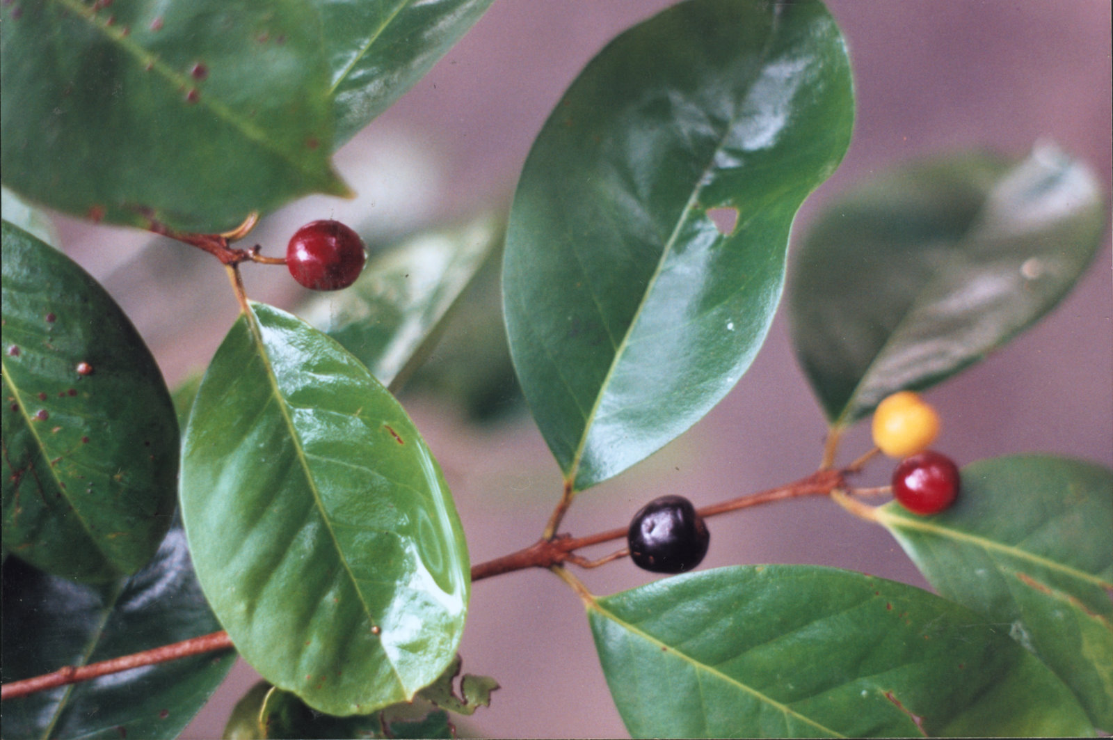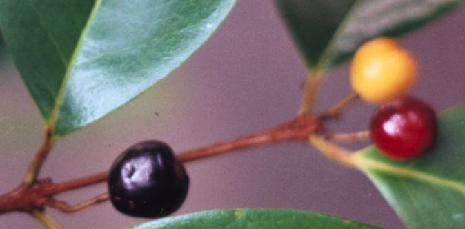 Fruits are small (1 cm), spherical drupes. Green at first, the record of their slow maturation is recorded by their color. Paling initially to golden-yellow, the fruits eventually darken to wine-red and finally ripen purple or black. Often, one fruit is borne in each leaf axil – on opposite sides of the twig – accentuating the paired and symmetrical appearance of the foliage. Each drupe consists of a thin layer of juicy, edible flesh surrounding a single, stony, pale orange and spherical seed (0.5 cm). Harvests – more consistent and regular than flowering periods – occur annually between August and October. Murta crop size may vary from season to season, though most years witness prolific fruit production.
