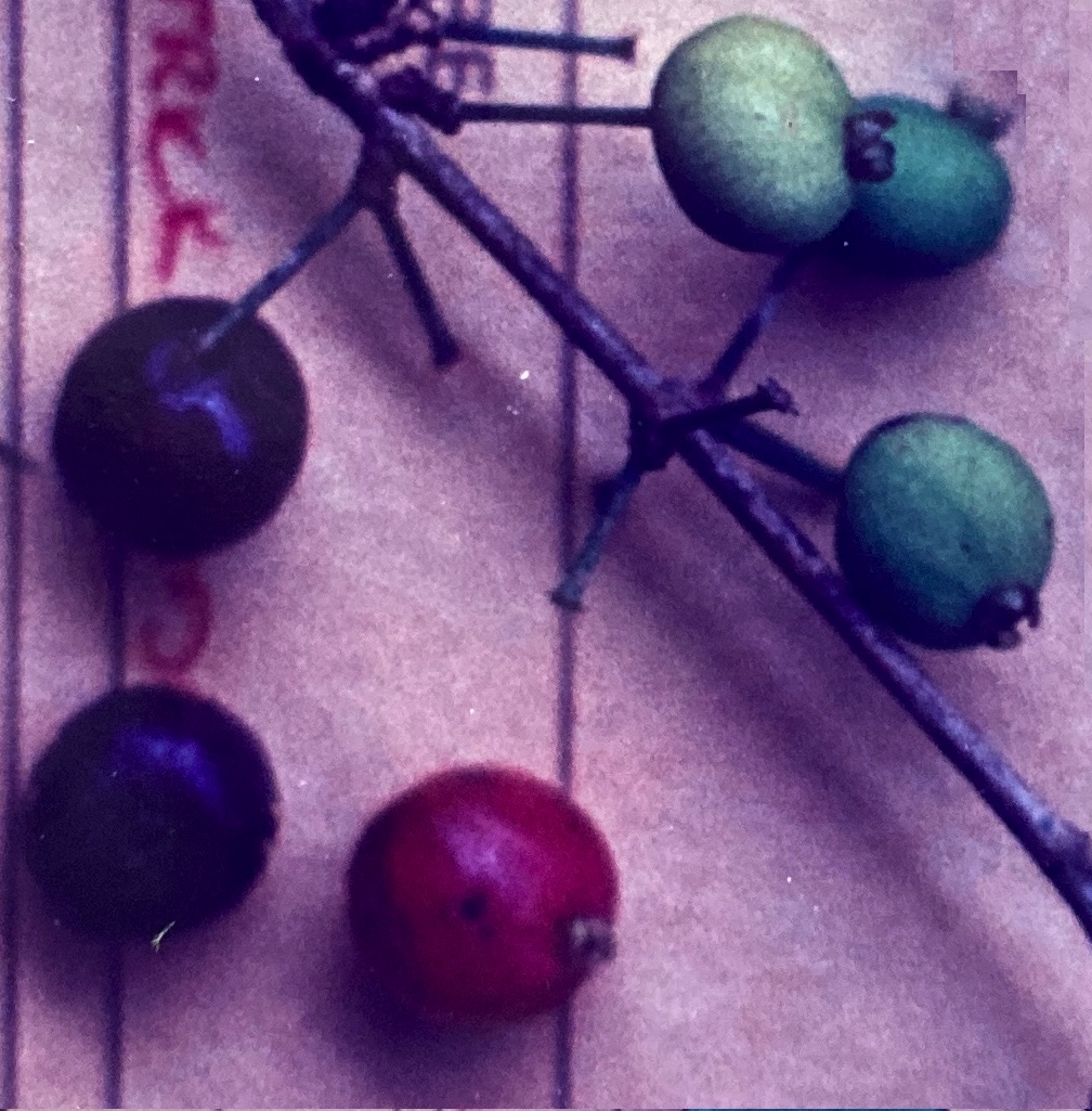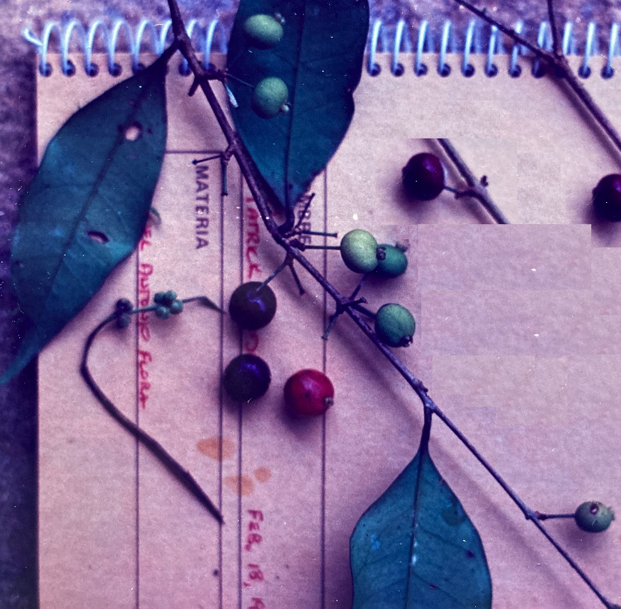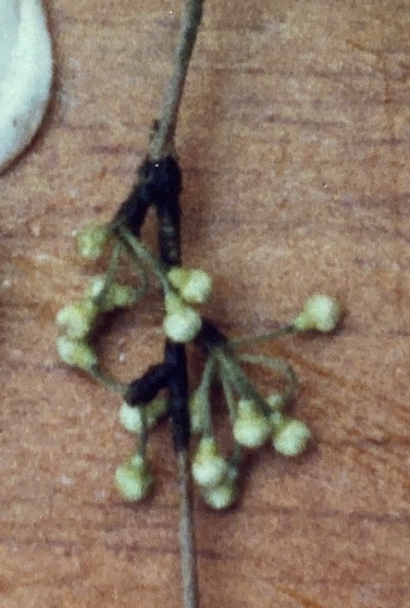 Fruits grow rapidly into small, green, spherical berries (6 mm in diameter) whose most noteworthy feature is the star-shaped flower calyx that persists distally on each. Ripening requires more time (up to several months), with fruits finally changing color from green through red and finally to black. A thin layer of juicy flesh surrounds a single, spherical, flesh-colored seed (4 mm). Arranged in small groups along the twigs and thinner branches, the fruits continue to be supported at the tips of the now stiff and woody pedestals. Harvests are variable in intensity and timing (correlated, as they are, to the irregular flowering events), but occur between November and February of fertile years. Fruitfall itself lasts for about six weeks.