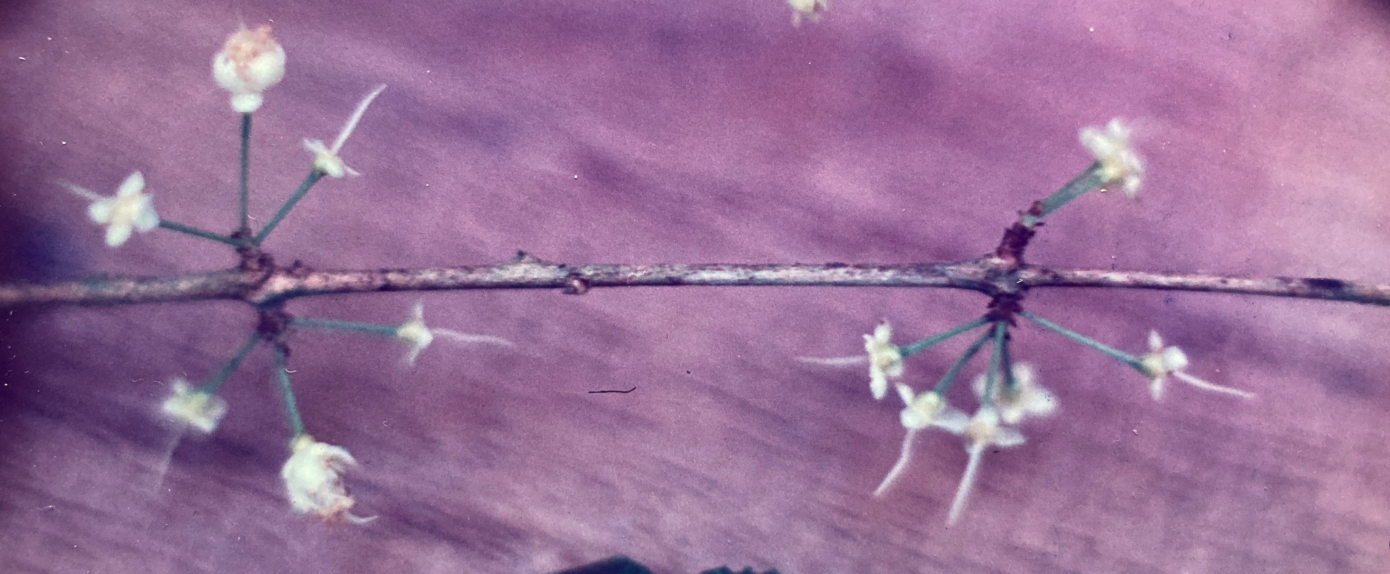 Eugenia flowers (3 mm) are minute, delicate, and white. Supported by a green pedestal (1 cm), each blossom is composed of 4 sepals, 4 tiny petals, multiple stamens, and a central pistil. Flowers are borne in compact cymes that can be found growing from current leaf axils as well as from axil scars located along the inner, bare portions of the branches. The distribution of blossoms within the crown is often unequal and irregular, with certain (often lower) portions of the crown being more fertile than others. Branches in full bloom are noteworthy, for they are highlighted by a subtle and understated dusting of white. Flowering periods are short, irregularly timed, but well synchronized events of less than annual frequency. During fertile years, flowers appear for one or two, two-week periods that occur sometime between the months of July and October (inclusive). Immediately thereafter, the delicate petals are shed and rain to the ground – leaving behind the swelling ovaries on their pedestals.