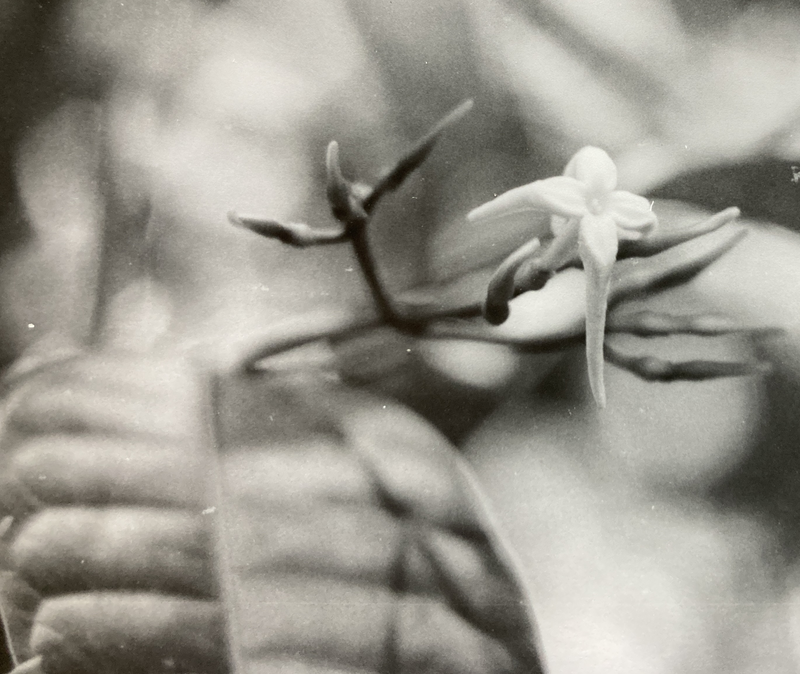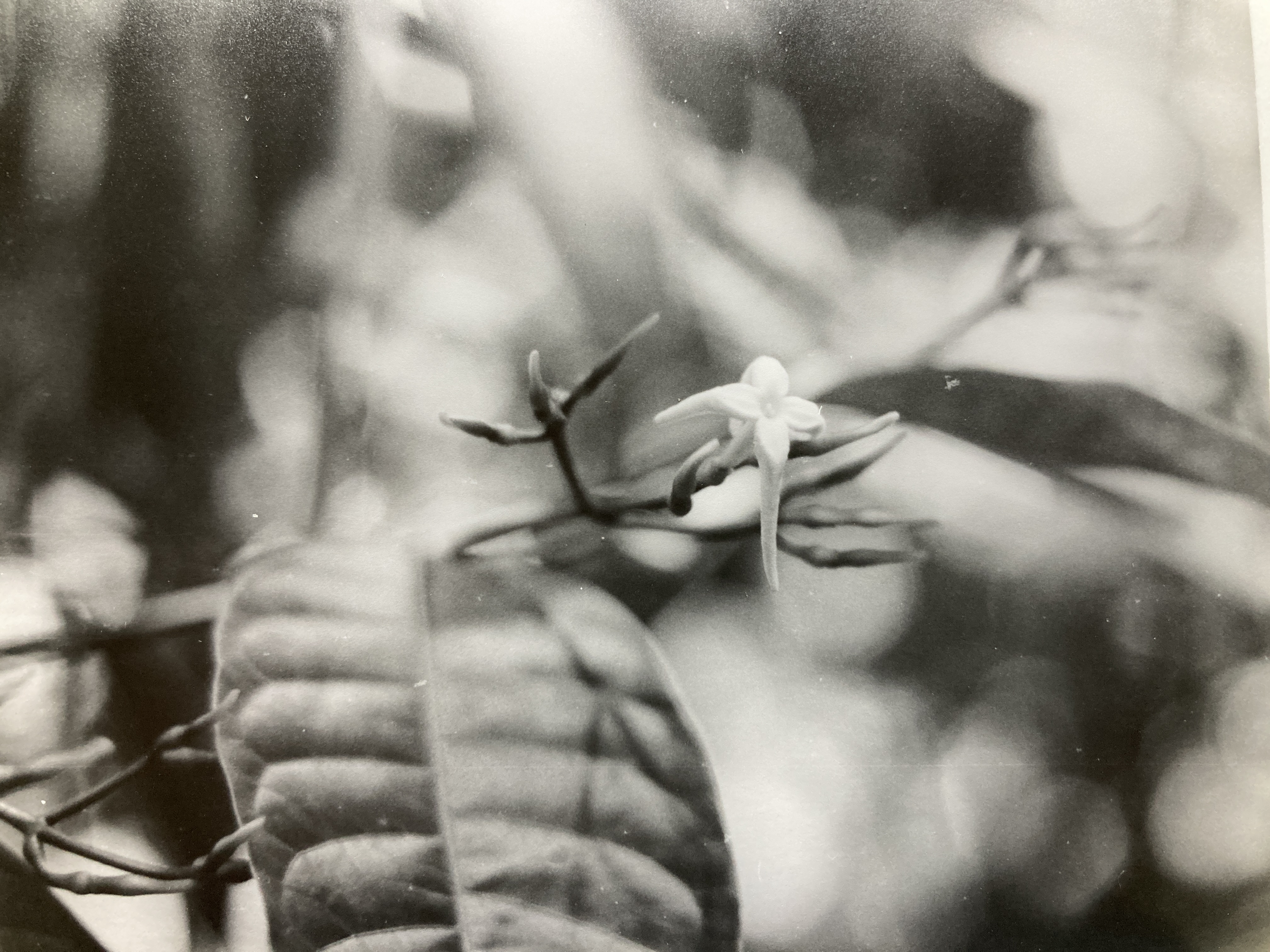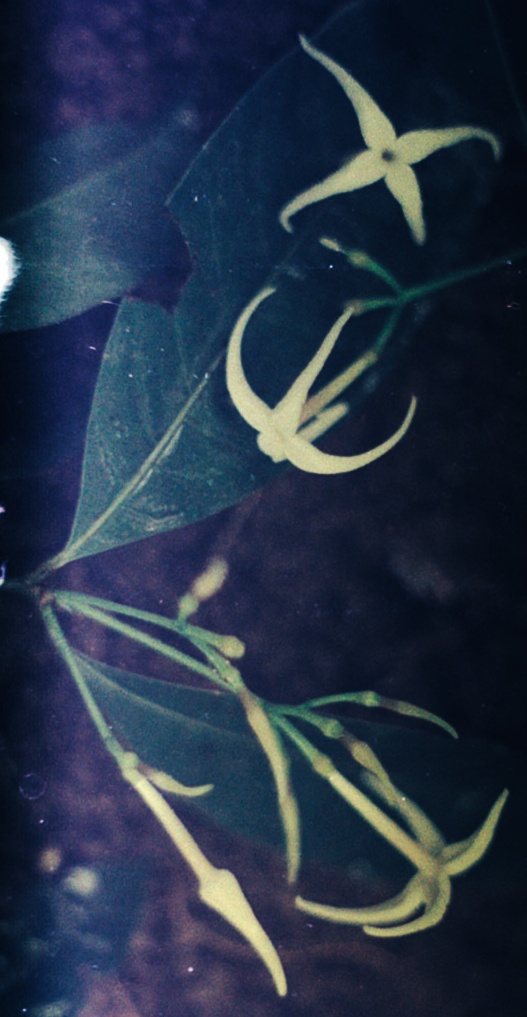 Flowers develop in terminal panicles (8 cm) that are composed of a few, relatively large blossoms. They appear first as tubular and long-tapering green buds that protrude from thick, cup-shaped calyxes (resembling the long, straight claws of some animal). At the base of each bud, a peculiar, rounded swelling marks the location of the inferior flower ovary. When mature, the now snow-white blossoms (3 cm long by 4 cm in diameter) sport a long, tubular corolla that ends in four, backward-curving and slow-tapering, spidery petals. The front of the flower – where the petals diverge from the corolla tube – is formed by the convergence of wider and flatter regions possessed by each petal at this point. Buried deep inside the corolla, a single pistil is topped by a two-part, leafy stigma. In addition to their distinctively stringy aspect, Faramea flower petals are thick and spongy. When squeezed, they exude a perfumey liquid that is responsible for the strong, sweet, candy-like odor that these blossoms emit. Flowering periods are highly synchronized events, however they are not consistent in size nor scope from one season to the next. Indeed, in some years (e.g. 1990, 1993) very few blossoms are produced, while in others (1989, 1992, 1995) they are apparently ubiquitous. In any season, flowering is an ephemeral event confined to a brief, two week period in May.