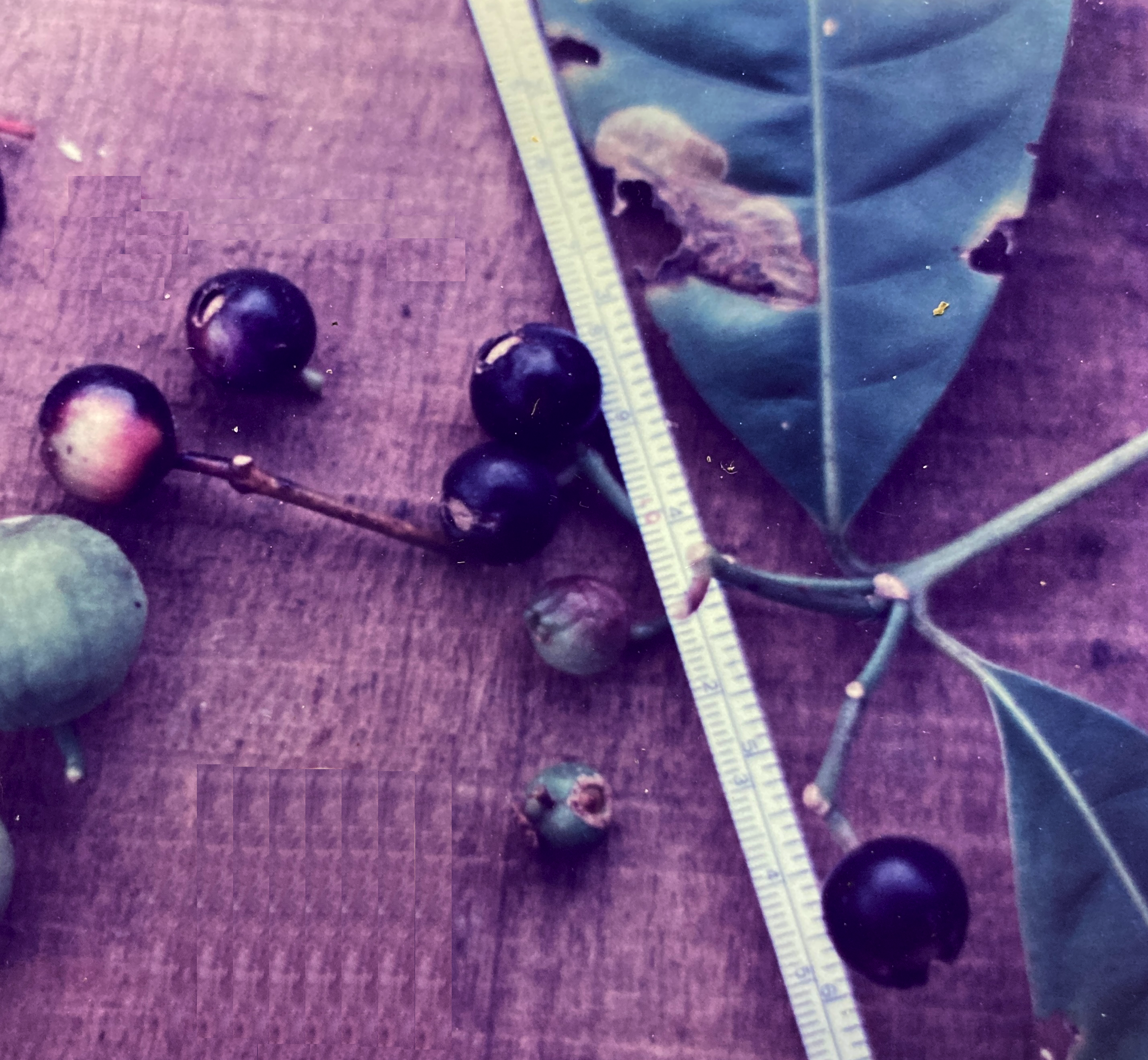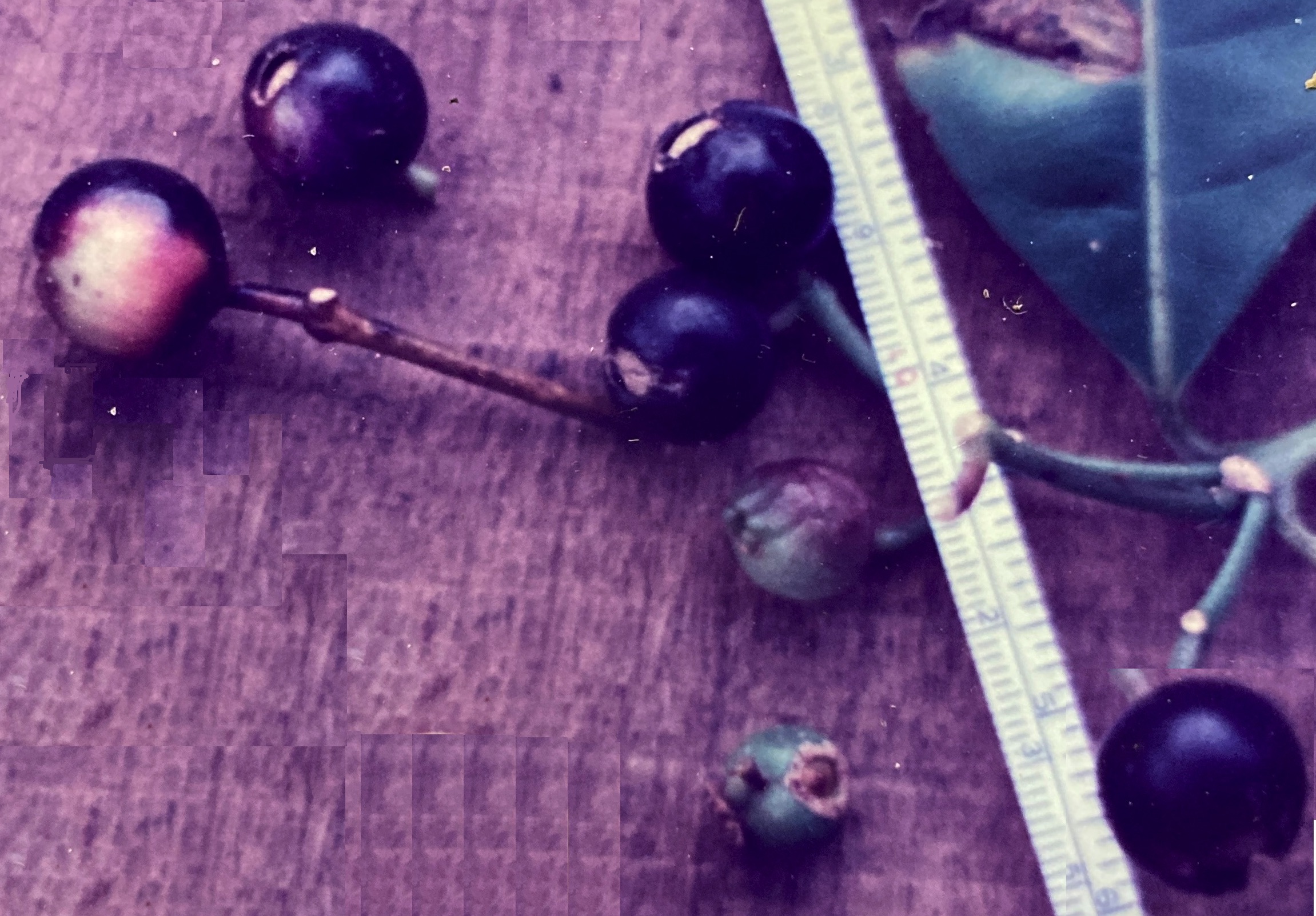 Fruits are plain, spherical drupes (1.5 cm). Resembling large blueberries, the persistent calyxes form circular depressions, scaring them distally. During the ripening process, their color slowly changes from pale green through pink, finally becoming a deep purple-black. Each drupe consists of a thick, fleshy layer of juicy pulp surrounding a single, 0.8 cm stony pit. Ripe fruits are present over a much more extended period than the blossoms, with harvests lasting from late September though early December. Logically, harvest size is directly correlated to flowering intensity for any given season.
