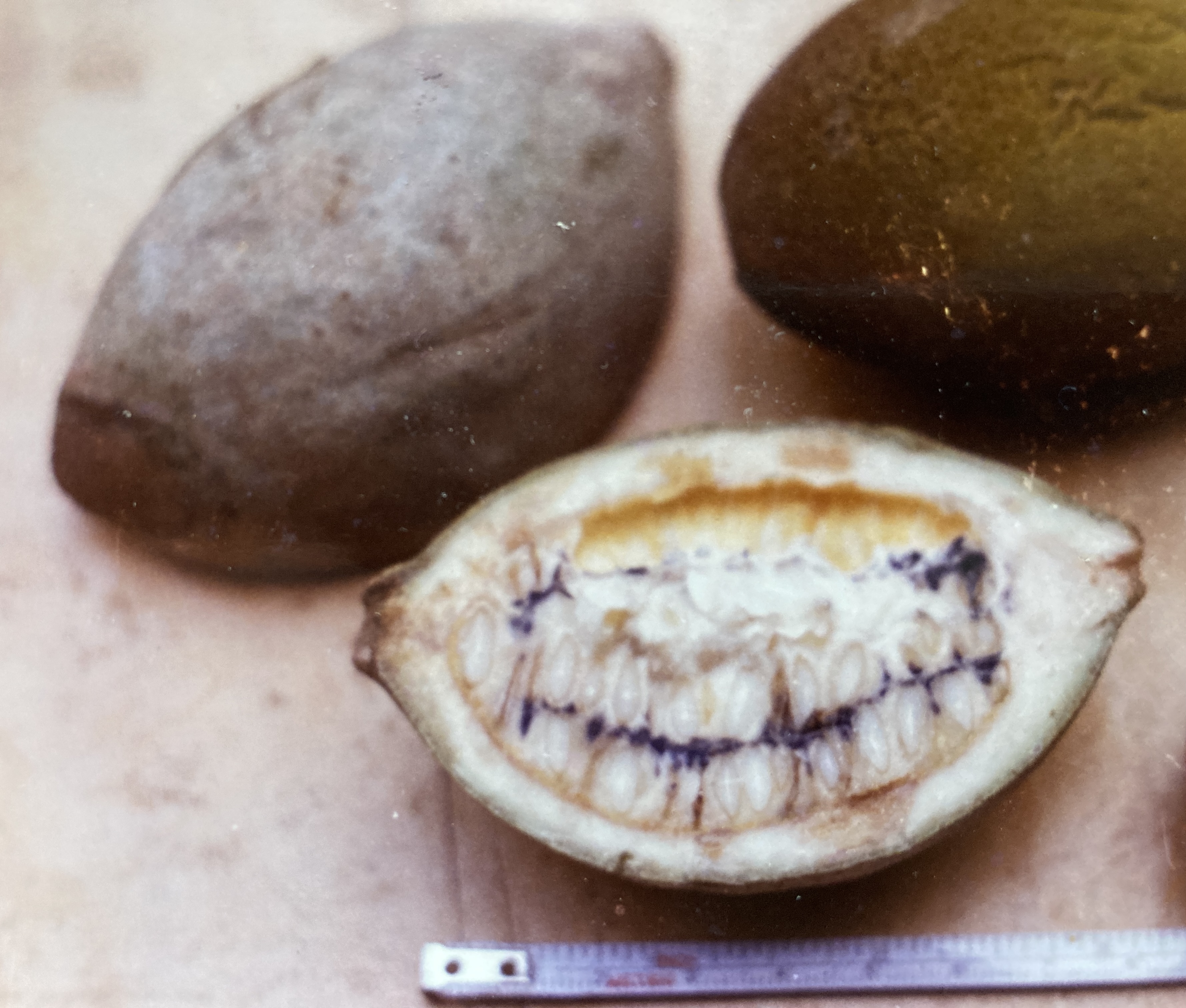 Fruits (12 cm by 6 cm) are large, football shaped berries. Many of them can be seen hanging vertically from short, stiff pedestals in female crowns, though usually only numbering one to a branch tip. In each, a coating of smooth, gray-green skin covers a thin layer of flesh and an inner core containing four tiers of tightly-packed, flat, incisor-like seeds radially arranged about the berry’s longitudinal axis. All of the interior portions of the fruit contain a clear liquid that turns blue-black or purple within two hours of exposure to the air – as does any part of the skin that has come into contact with it. Fruits are persistent on the trees, slowly maturing and falling from the crown all year long. Seeds germinate within a couple of weeks of coming into contact with moist soil.
