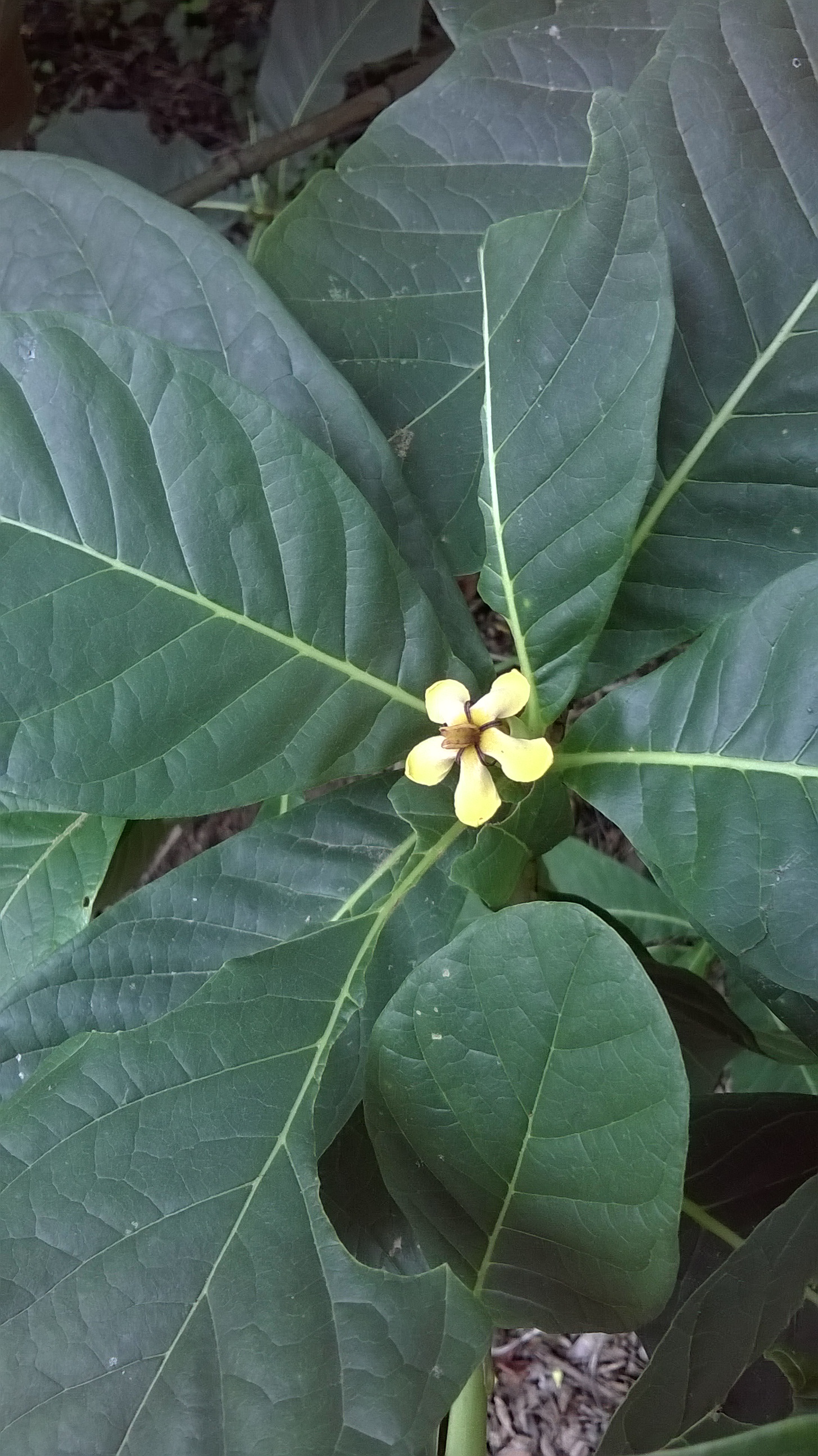 Occasional evergreen subcanopy tree (15-20 m) found growing widely – though thinly – dispersed in a variety of different habitats. Known to indigenous peoples of the region, Guaitil produces large, green fruits that were used as a source of a skin-tinting, purple dye. Large, leathery yellow flowers, found most frequently on the forest floor underneath male trees, are also a hallmark of this species.