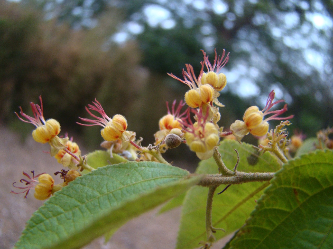 Simple and alternate, Guacimo leaves are variable in size, averaging 12 cm in length by 6 cm in width. They have serrulate (finely serrate) margins, moderate drip-tips, and 1 cm petioles. Blades are of approximately lanceolate (spade) shape and have unequal, asymmetrical bases. Velvety in texture, leaf surfaces, veins, petioles, and young twigs are all cloaked in a thin layer of yellowish pubescence. Leaf senescence and loss begin in December and continue, at a slow pace, through March. Though new sprouts appear on the twigs almost immediately, they grow very slowly during the early dry season, leaving the trees largely bare for at least a portion of these months. Anticipating the return of wet conditions, Guacimo trees resume active growth in March, establishing a full and fresh leaf cover by late April.