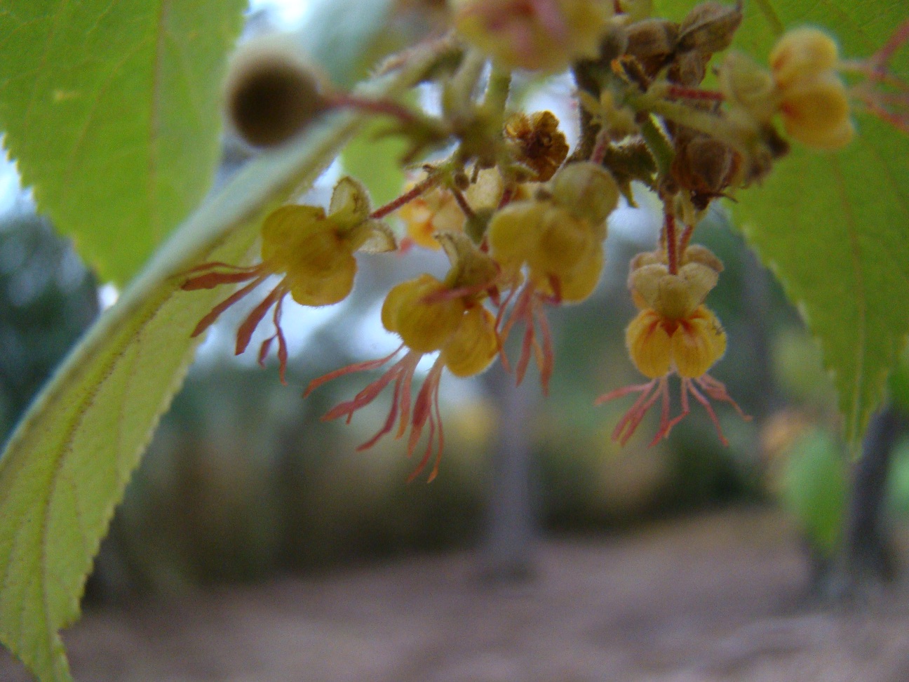 Flowers appear as soon as the new shoots do, from leaf axils and arranged in compact cymes. The globular, green buds open into small (0.5 cm), pale yellow flowers with brown highlights. Each contains three sepals, five petals, five forward-projecting staminoid appendages, and five true stamens located inside the corolla. Flowering activity is maintained at a low level until March, when the increased rate of foliage growth results in a prolific burst of flower production that lasts through April.