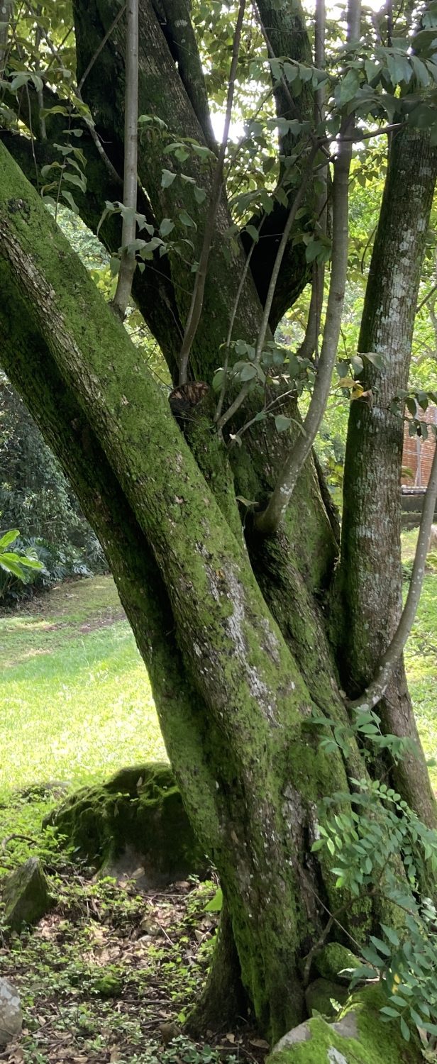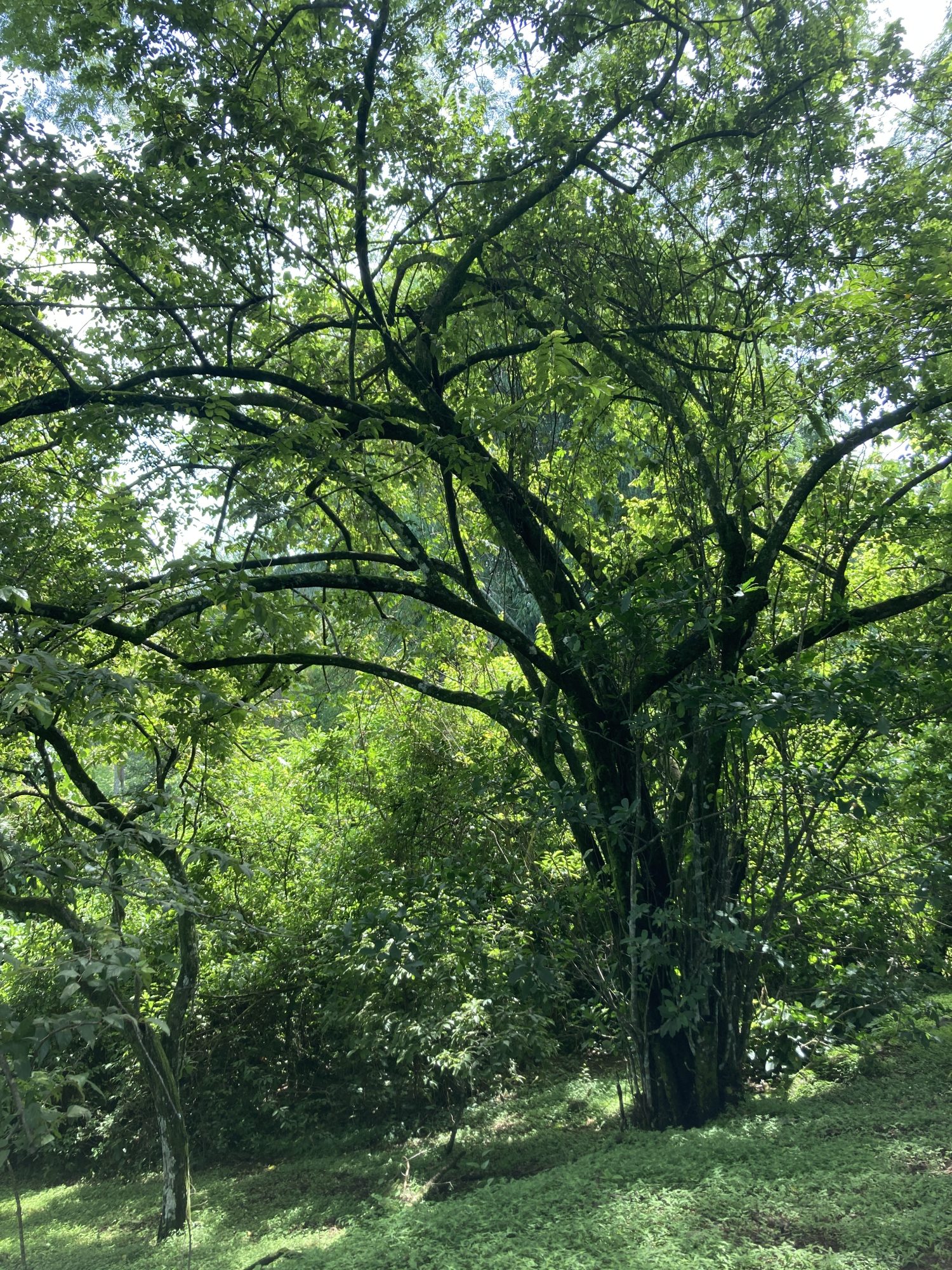 Description: When found growing in open areas (e.g. pastures, roadsides) this tree often resembles a very large, overgrown shrub, with multiple, thin trunks (15 cm) and arching branches (or with a single, stouter bole, subdividing into branches less than a meter above the ground). Such specimens sport an abundant tangle of limbs covered with a thick layer of foliage, providing a dense, wide, and rounded crown. Forest specimens, corresponding more closely to the arboreal stereotype, generally exhibit single, unbranched boles of moderate thickness (35 cm) and stature, as well as narrow and open canopies. In all cases, the trunk is irregular, creased by shallow indentations or folds, and clad in roughly textured, light gray bark.