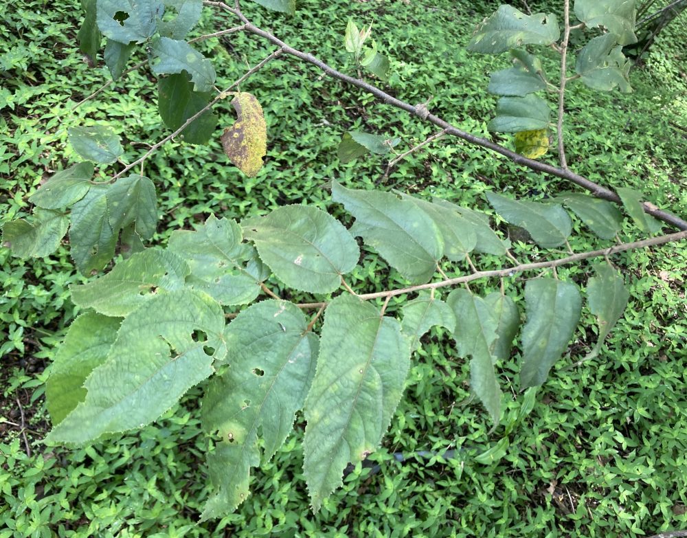 Similar Species: Goethalsia meiantha and, to a lesser extent, Apeiba tibourbou, are secondary forest trees whose foliage bare a superficial resemblance to that of Guacimo blanco. Still, Goethalsia and Apeiba lack the predominately shrubby growth habit of Guacimo and their leaves are significantly larger. In addition, Guacimo’s knobby, black fruits are unique and they are present (in some more or less developed condition) during 10 months of the year. Even when absent from the crown, these rot-resistant orbs can usually be located on the ground beneath the trees.