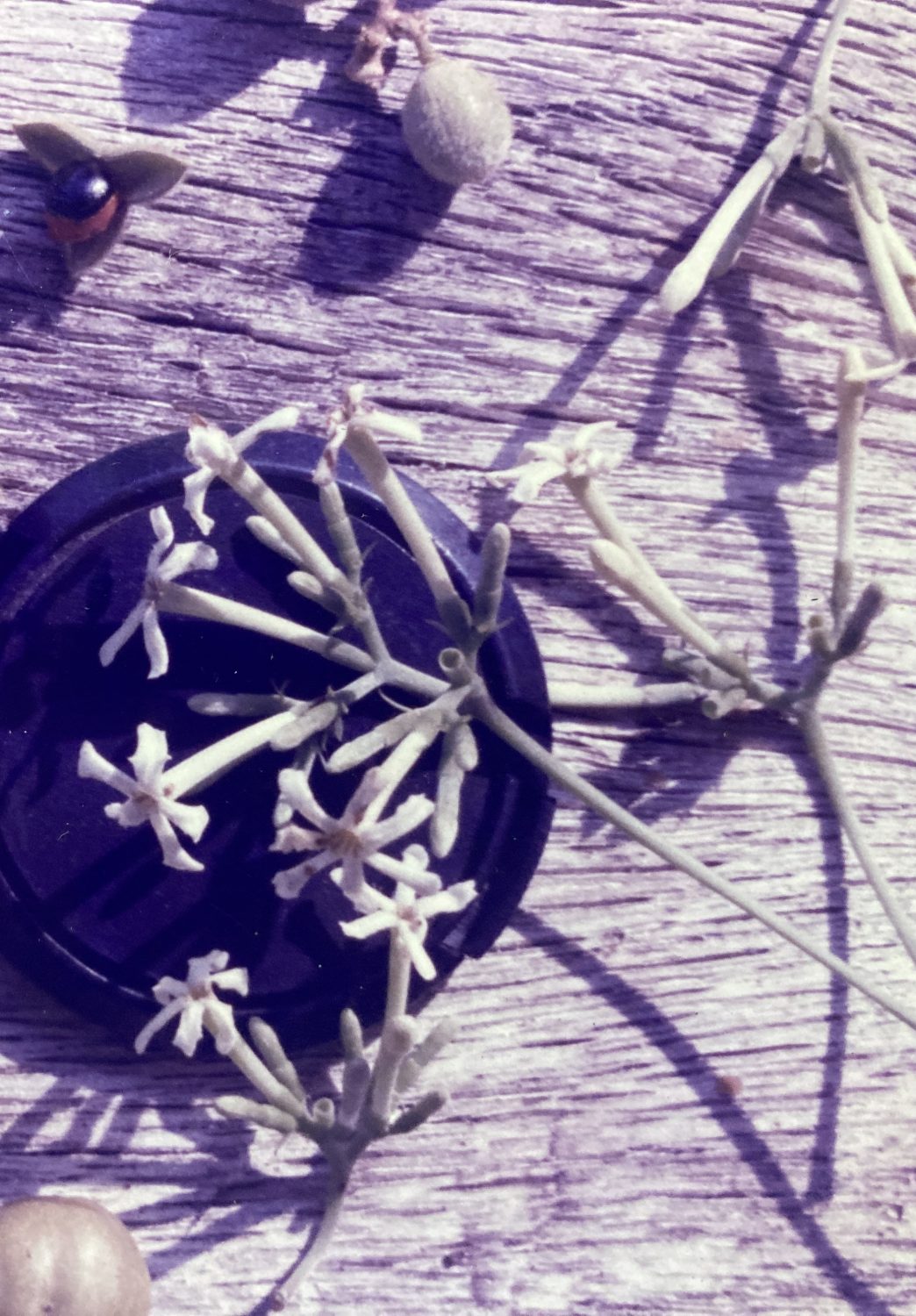 Flowers appear shortly after re-foliation, growing slowly from spindly panicles (8 cm long or more) joined to leaf axils. Each inflorescence generates about ten off-white or pale green blossoms (2 cm long by 1 cm in diameter). Dominated by a narrow, silky-textured corolla tube that flares into in six (sometimes five) rectangular petals, the flower also contains six (sometimes five) tiny stamens attached to the upper neck of the tube and a small stigma located just below the stamens. At its base, the corolla is mounted on a green, cup-like calyx. Thanks to the length of the long panicle stalks, the flowers are positioned just below the fresh foliage on the branches. Quite inconspicuous nevertheless, their aromatic and sweet odor serves to attract insect pollinators. Flowering periods are precisely timed, annual events, though they are only moderately well synchronized between individuals. Blossoming begins in late June and lasts through early August.