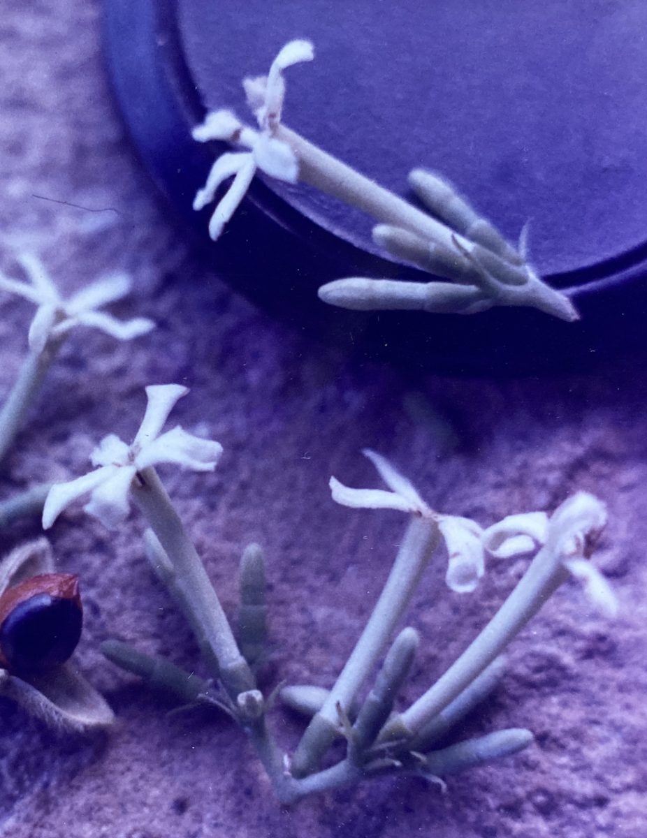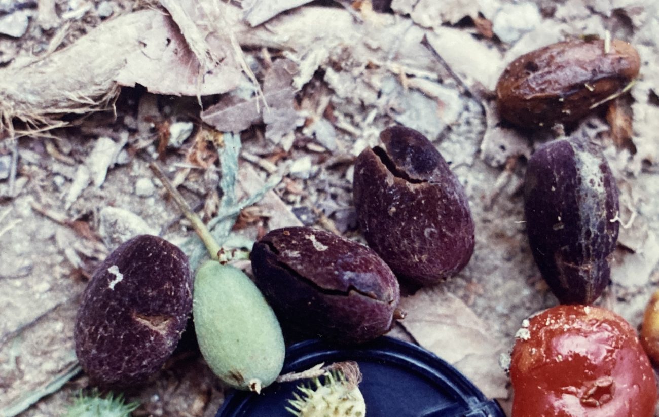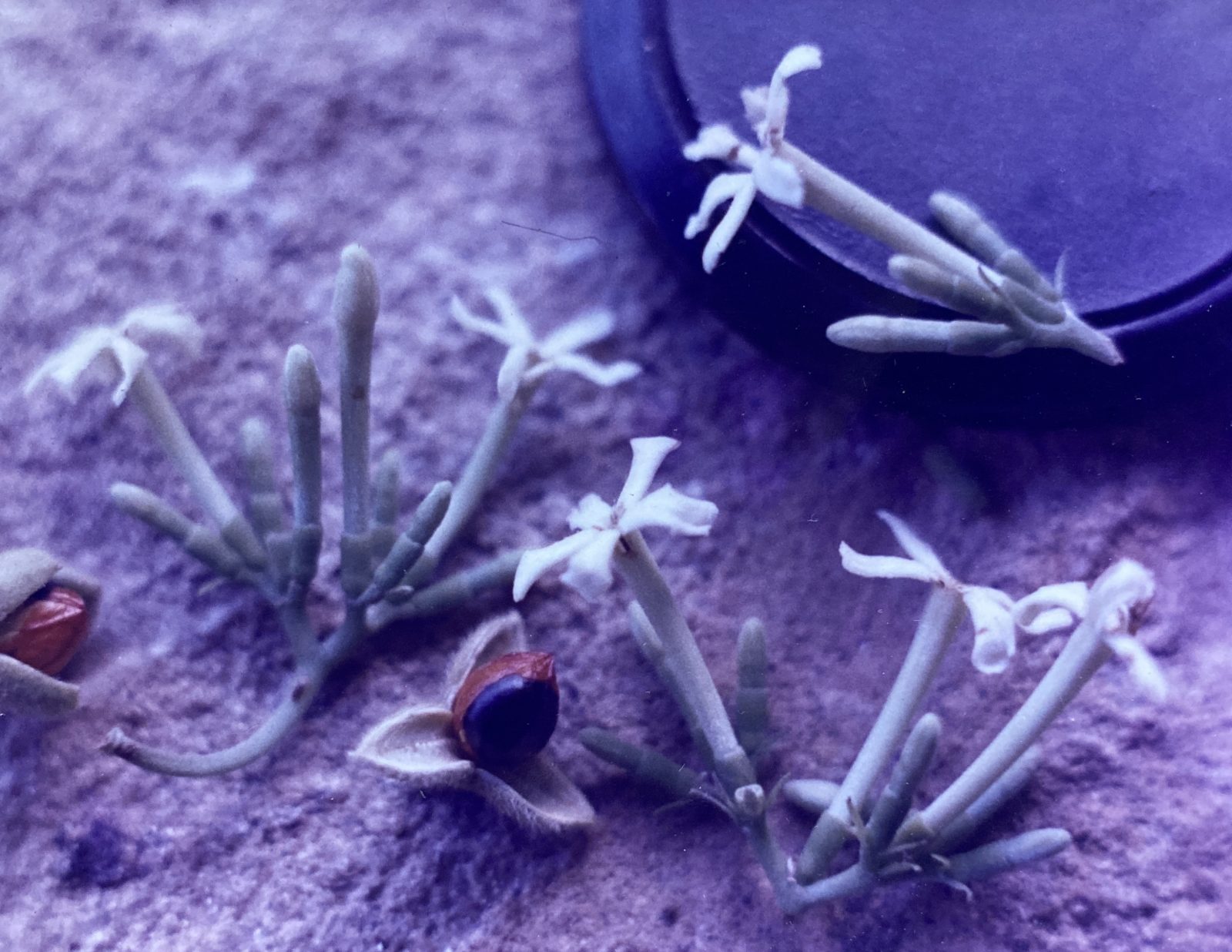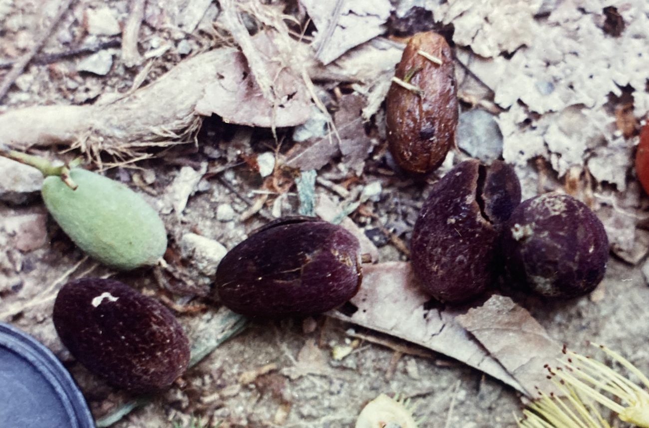 Fruits are cylindrical drupes (2.5 cm by 1.5 cm) that bear distinctive, terminal points or snouts. Initially covered by green, silky and leathery skin, they persist in the canopy for four months during development. Finally ripening, the drupes change color to deep purple. Each consists of a thin layer of moist, whitish pulp and a single, fibrous, cylindrical pit (2 cm). The annual harvests are consistently prolific in nature, and they last from late November through early January. Presumably, Guettarda seeds germinate with the first rains of the wet season – sprouting seeds (and seedlings) are rarely seen and their viability appears to be low.