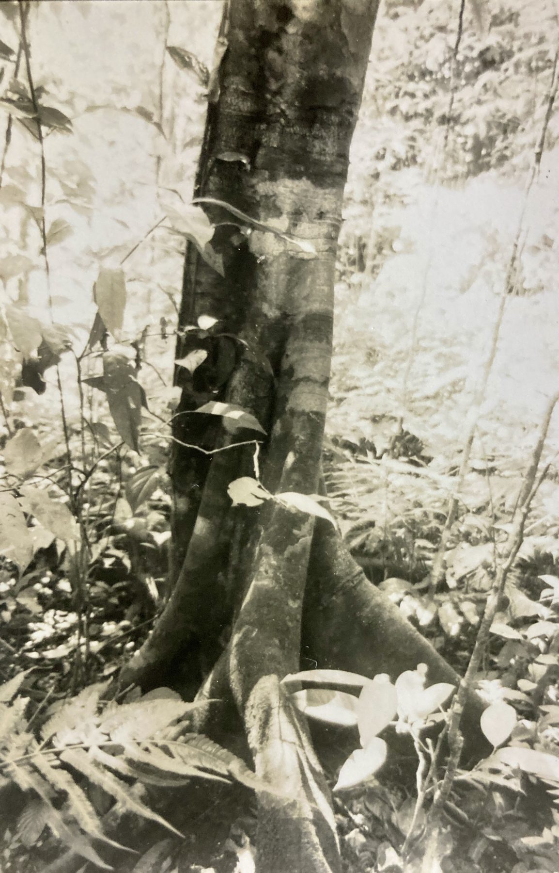Description: Guettarda trees are generally small, with trunks that rarely exceed 25 cm in diameter (one individual, found growing near Punta Serrucho, measured 30 cm in diameter and was 20m high). The buttressless bole is cylindrical, (or sometimes slightly folded) and straight, with smooth, gray-green bark that is periodically punctuated – especially on younger trees – by sharp thorns (1-2 cm). Branches occur along the upper third of the trunk and they form a rounded, dense crown of a single-layer. Leaves, found more or less clustered around branch tips, are large (17-22 cm by 5-8 cm), simple, and oppositely arranged. The wide, elliptical, smooth blades are supported by very long (2-3 cm) petioles. Drip-tips are small or lacking entirely. A strongly impressed and easily recognizable pattern of leaf veins is present on Guettarda foliage and this characteristic proves very useful in the field identification of this species. When viewed from underneath, these bundles of vascular tissue create an opaque, silvery-white, fishbone (pinnate) pattern framed against the translucent green of the surrounding leaf mesophyll tissue. A deciduous tree, Guettarda leaves yellow and are rapidly shed in March. Trees remain leafless until early May.