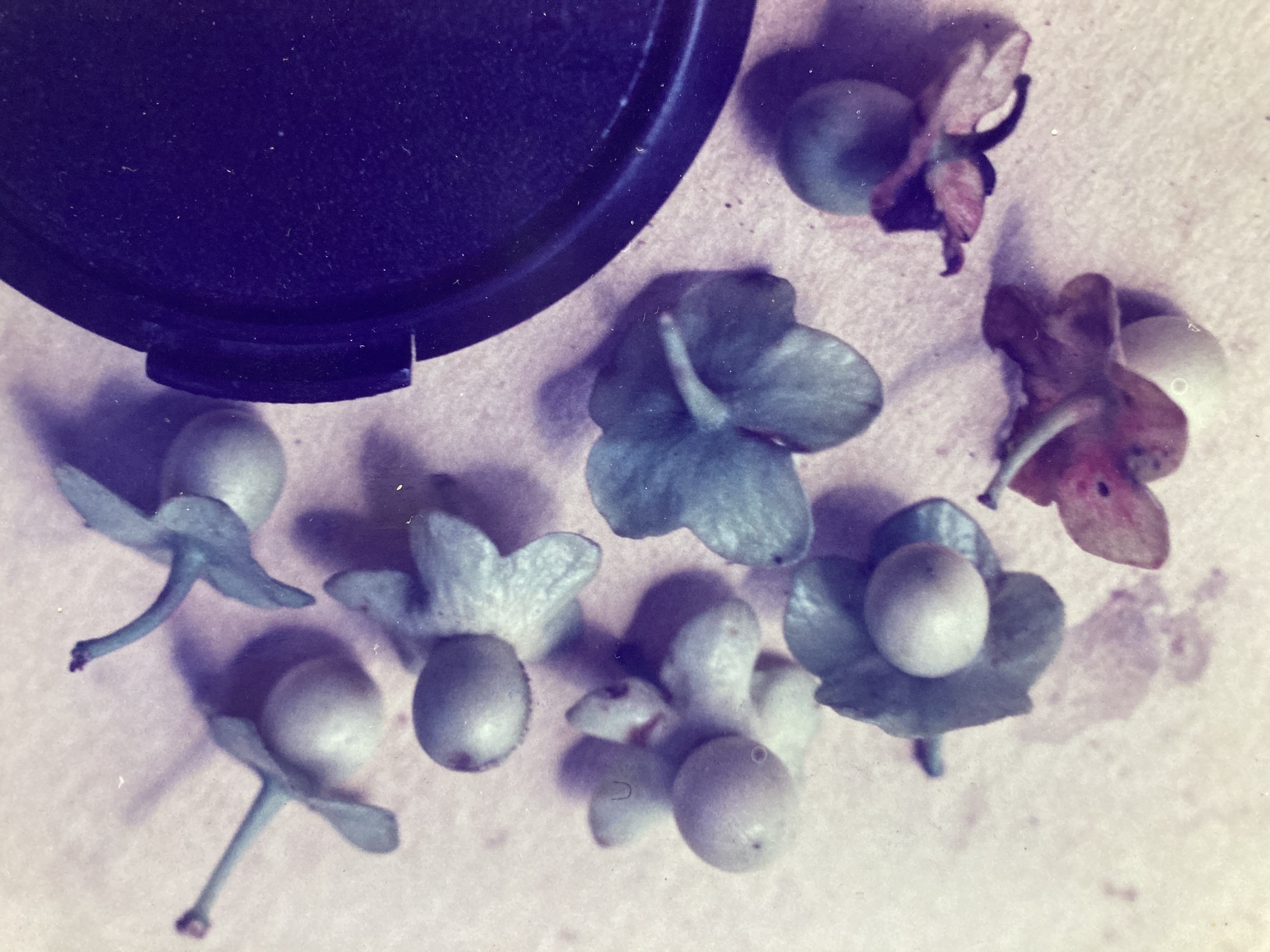 Small fruits (1 cm) grow rapidly, reaching maturity only two months after flowering ceases. Each pale green (or off-white), spherical drupe is dominated by a flat, 5-lobed apron. Attached proximally, this collar-like structure turns from green to pink upon ripening, eventually becoming a deep purplish-red color. Even after the drupes have been harvested, these brightly colored aprons persist in the trees, providing a startling though welcome splash of color amid the monotonous and dull forest greens of the foliated branches. Inside the drupe, a thin layer of flesh conceals a single, black, spherical seed. The frequency and timing of Heisteria harvests mimic those of the flowering periods, with ripe fruits in evidence during seemingly erratic and multiple intervals during the year. However, harvests tend to be largest and most consistently generated during January-February and August-September.