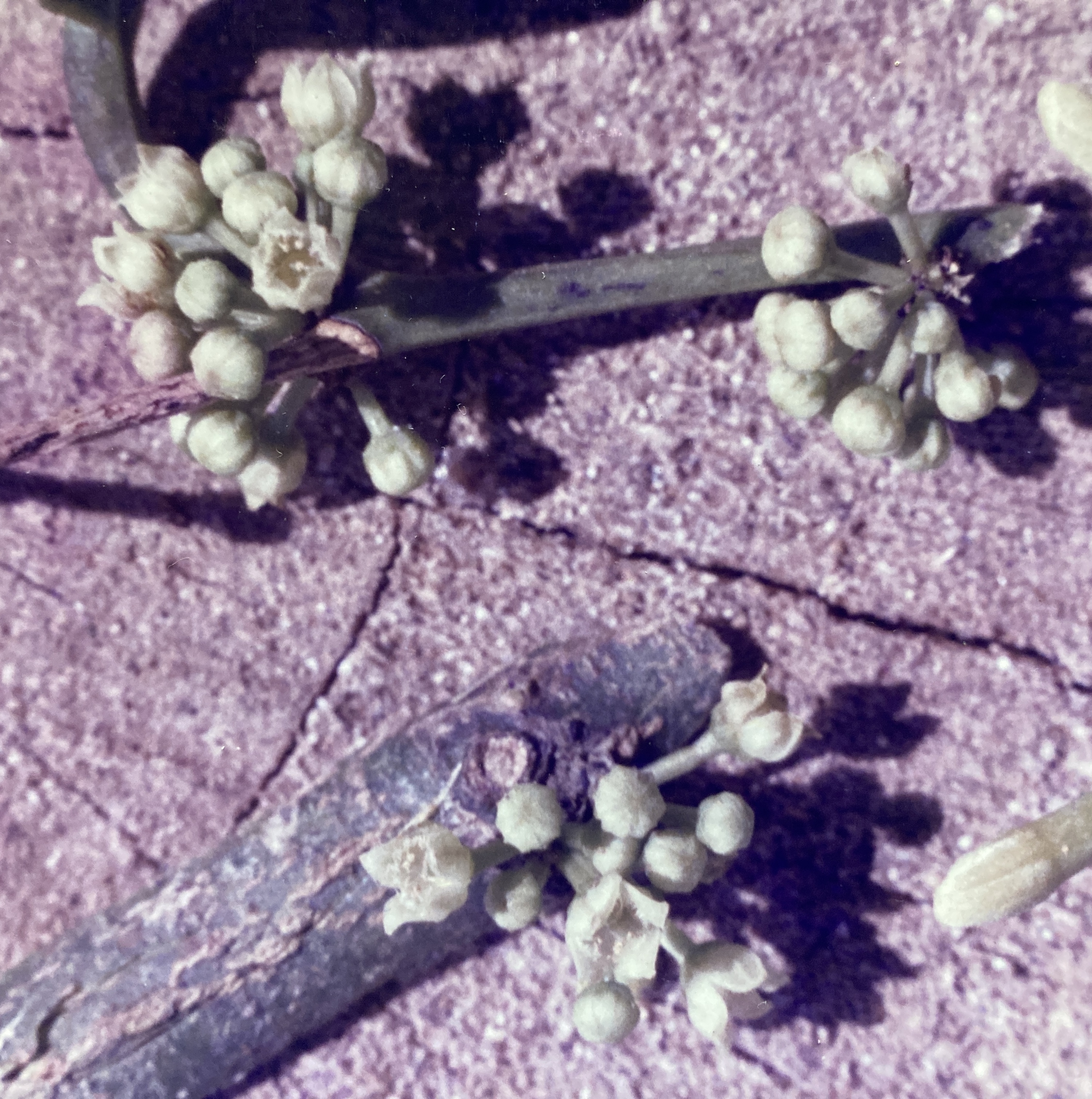 Forming compact clusters, flowers (3 mm by 1 cm) grow from the fibrous tufts located in old leaf scars (along the bare portions of the twig) as well as in the axils of current leaves. Each green blossom consists of five minute sepals; five green, pointed, and outwardly-curving (even sculpted) petals; a single short, green pistil; and a 6 mm pedestal. About ten tiny stamens are found attached to the petals and are bent towards the pistil. Sweetly fragrant of carnations, Heisteria blossoms are sometimes sufficiently odorous to be detectable from the ground beneath the trees that bear them. Flowering periods are short (generally lasting for only two weeks), well synchronized, and annually occurring – but their timing is irregular. Blossoms have been observed in January, March, June, September-October, and November, but are probably most abundantly and consistently produced in the June and September-October events.