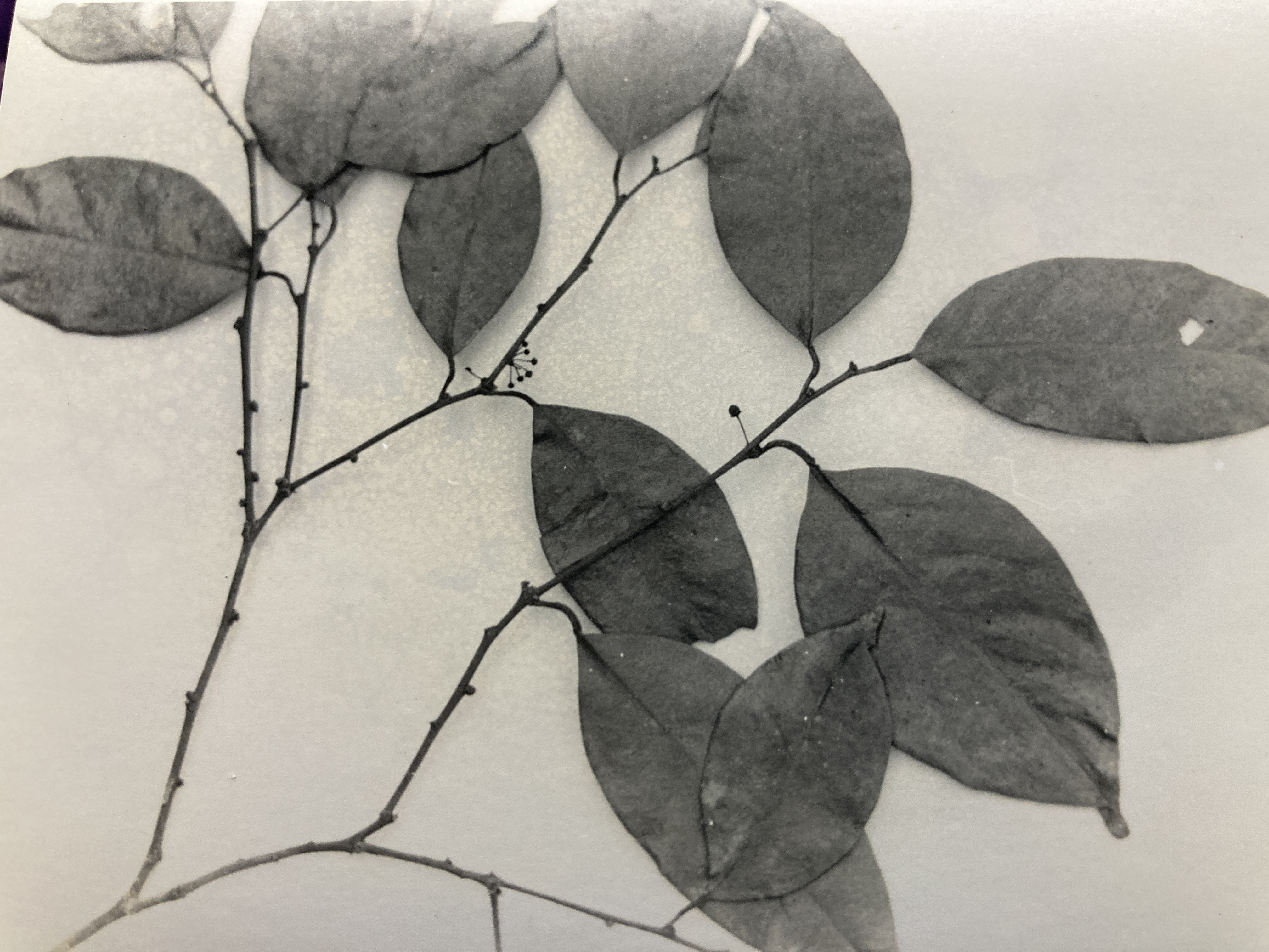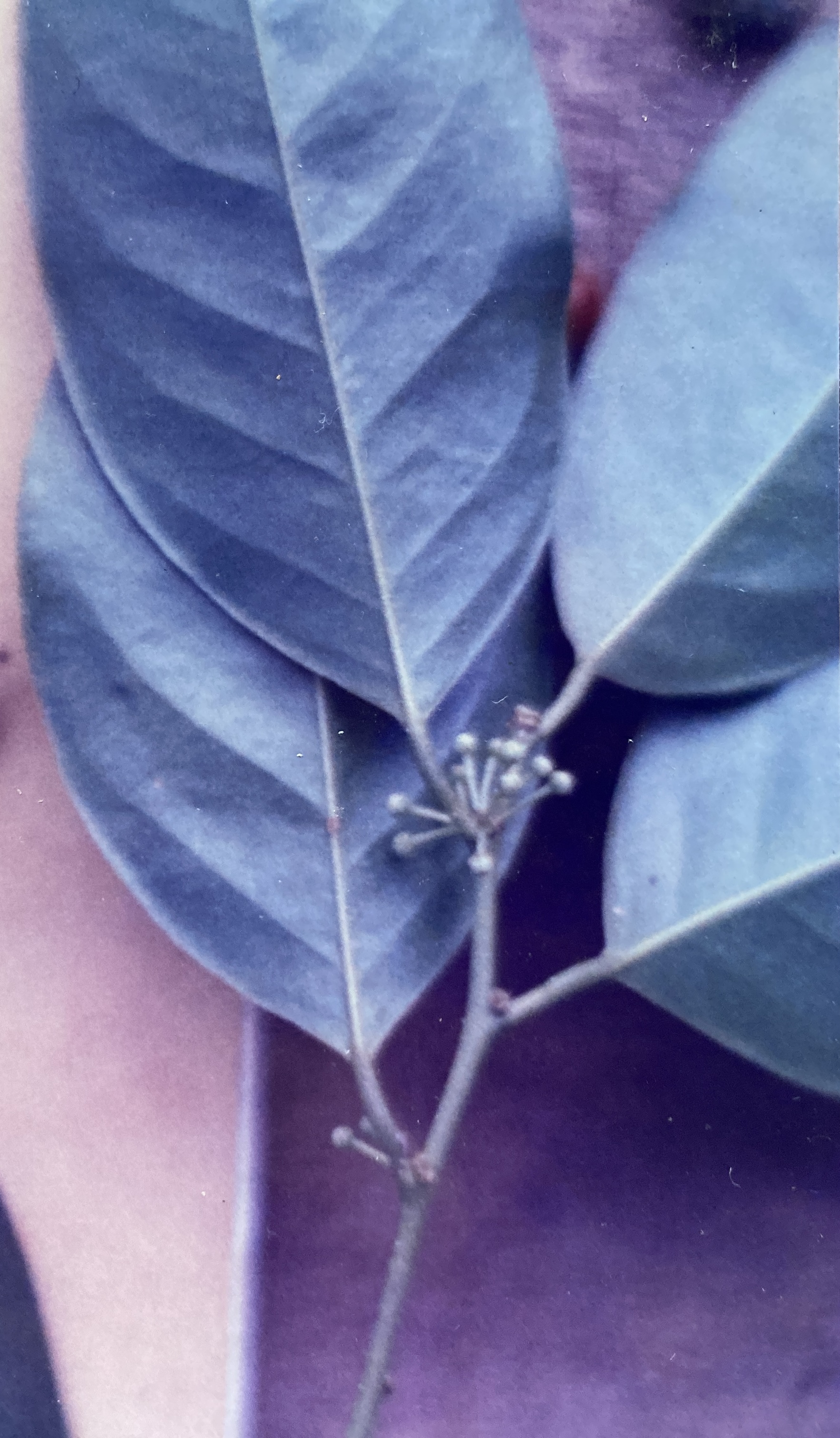 The thick and leathery leaves are simple and alternately arranged. Of extremely variable size, they range from 7-12 cm in length, and 3.5-6 cm in width (averaging 9.5 by 4.5 cm). The widely elliptical blades are terminated proximally by minute drip tips (0.5 cm) and proximally by dorsally grooved and sometimes swollen petioles (1 cm). (These latter structures are often colored black, contrasting strongly with the brown hue that dominates the surrounding twigs.) New foliage may occur more than once and at any time during the year. As is the case with the fresh leaves from so many other trees, recently expanded Heisteria foliage is eye-catching, thanks to its pale, translucent-green color.