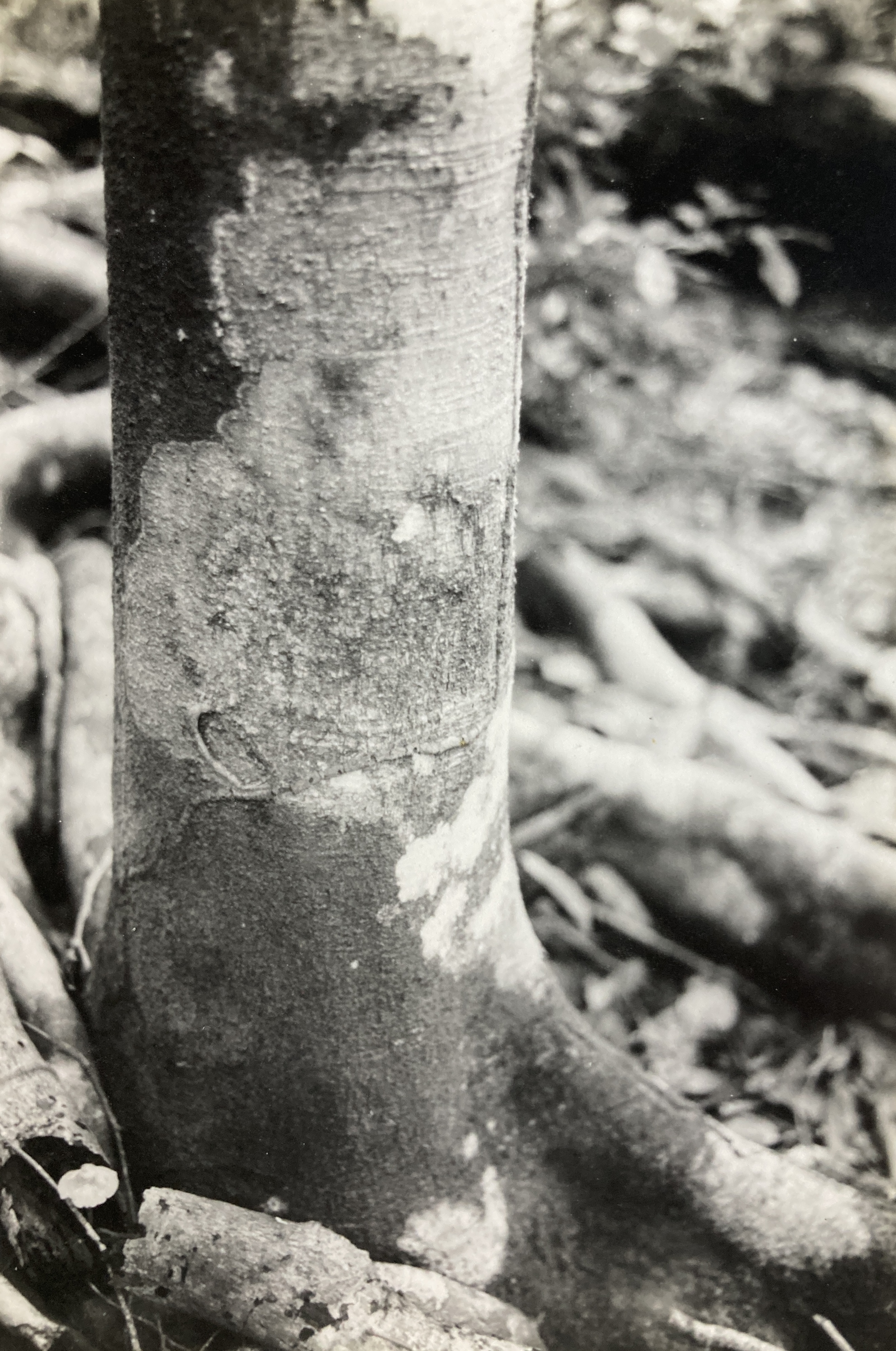 Description: Heisteria has a straight, cylindrical, buttressless trunk that rarely exceeds 20 cm in diameter. Clad in mostly smooth, dark brown bark, the bole sprouts branches along the upper third of its length. These limbs are generally long, flexible, and thin – and they often sag under the burden of their own weight. Prominent leaf scars, present on the branches and twigs, possess small, woolly, fibrous growths (from which flowers periodically emerge). These swellings cause small Heisteria limbs to appear noded and angular – a unique and characteristic feature that is extremely useful in the identification of this species. Together, the loose association of limbs generates a rounded crown of moderate density.