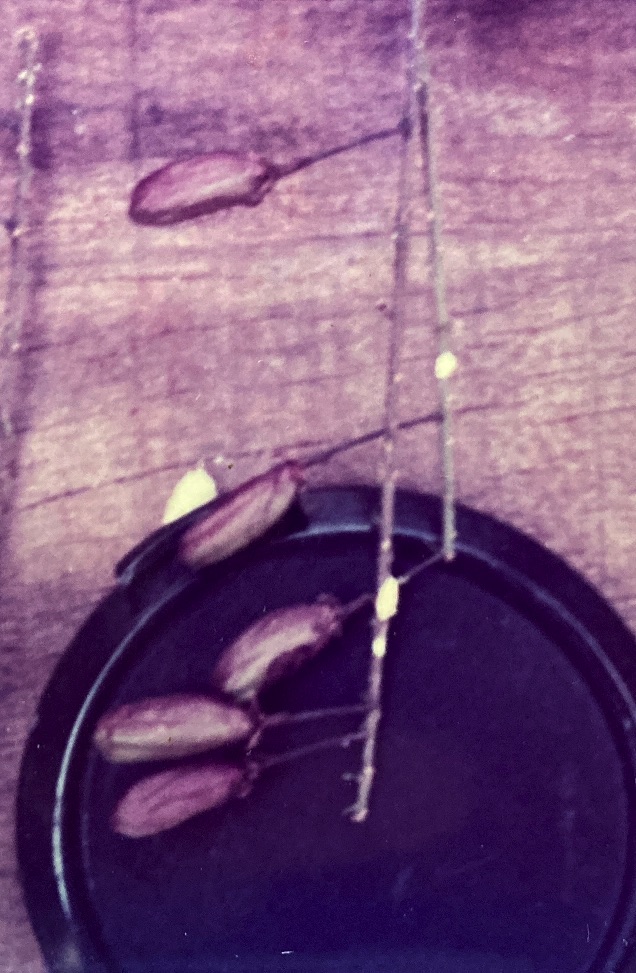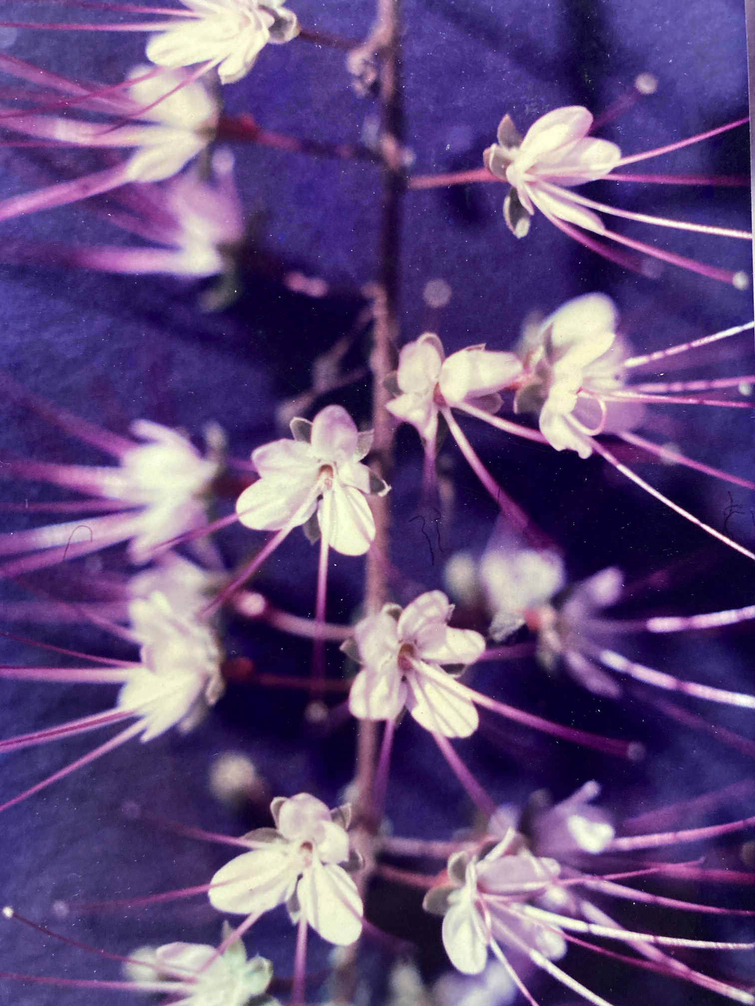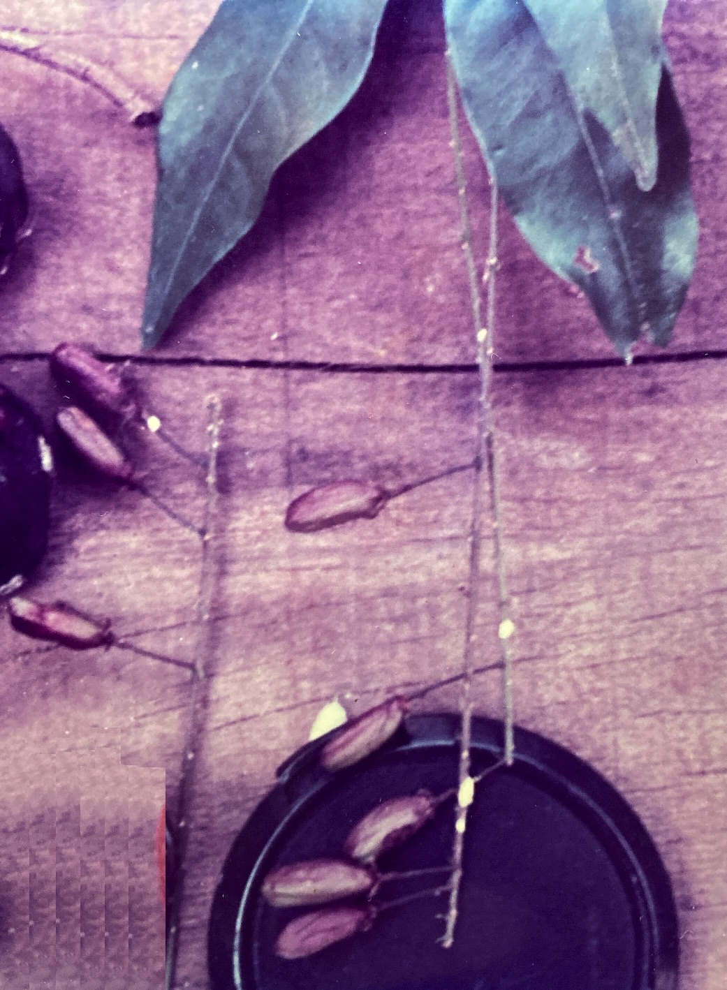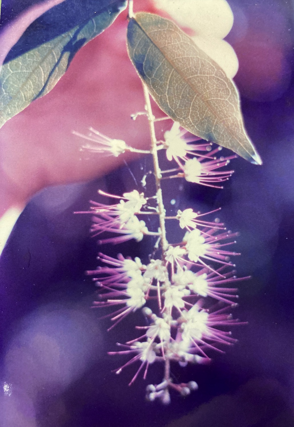 Flowers (3.5 cm long by 0.8 cm in diameter) are produced in long (10 cm) terminal racemes that dangle vertically from the branch tips. Each flower, attached by a 1.5 cm stalk to the main axis of the raceme, consists of five small, green sepals; five delicate and even smaller violet petals; five long (2 cm), lavender stamens; and a similar pistil. All buds in a raceme blossom in unison, generating a cylindrical mass of lavender stamens that radiate outward from the raceme’s central axis (like a bottle brush). Punctuated by the soft flecks of violet petals, these blossoms can be a stunning sight. When illuminated from behind by the sun, this translucent inflorescence seems to glow with its own violet light. Flowering periods are sporadic and individual trees may be seen with blossoms anytime between September and April, but the most synchronized and abundant events occur in January and early February. Fruits are elongated (2 cm) berries that may be plump and juicy but are more often shriveled and pasty. They ripen from green to maroon or black and enclose a single, rod-shaped seed. Most fruiting occurs in February and March.