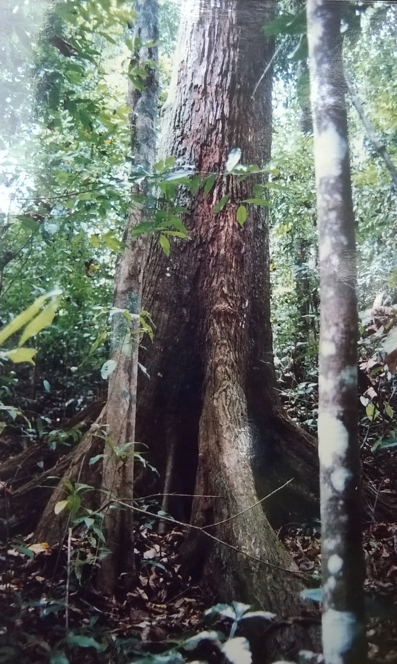 The apparent preference of mosses for Pilon bark can perhaps be explained by its water-holding capacity. Porous, especially near the tree’s base, this thick bark can absorb much moisture. Deep in the lower layers of the primary forest where there is no sunlight, this bark stands little chance of drying out. Mosses, non-vascular plants possessing no water-conserving cuticle over their exposed tissues, need a constant supply of water in order to avoid desiccation. The thick bark of Pilon trees can provide a steady and ample water supply in a way that few other trees can.
