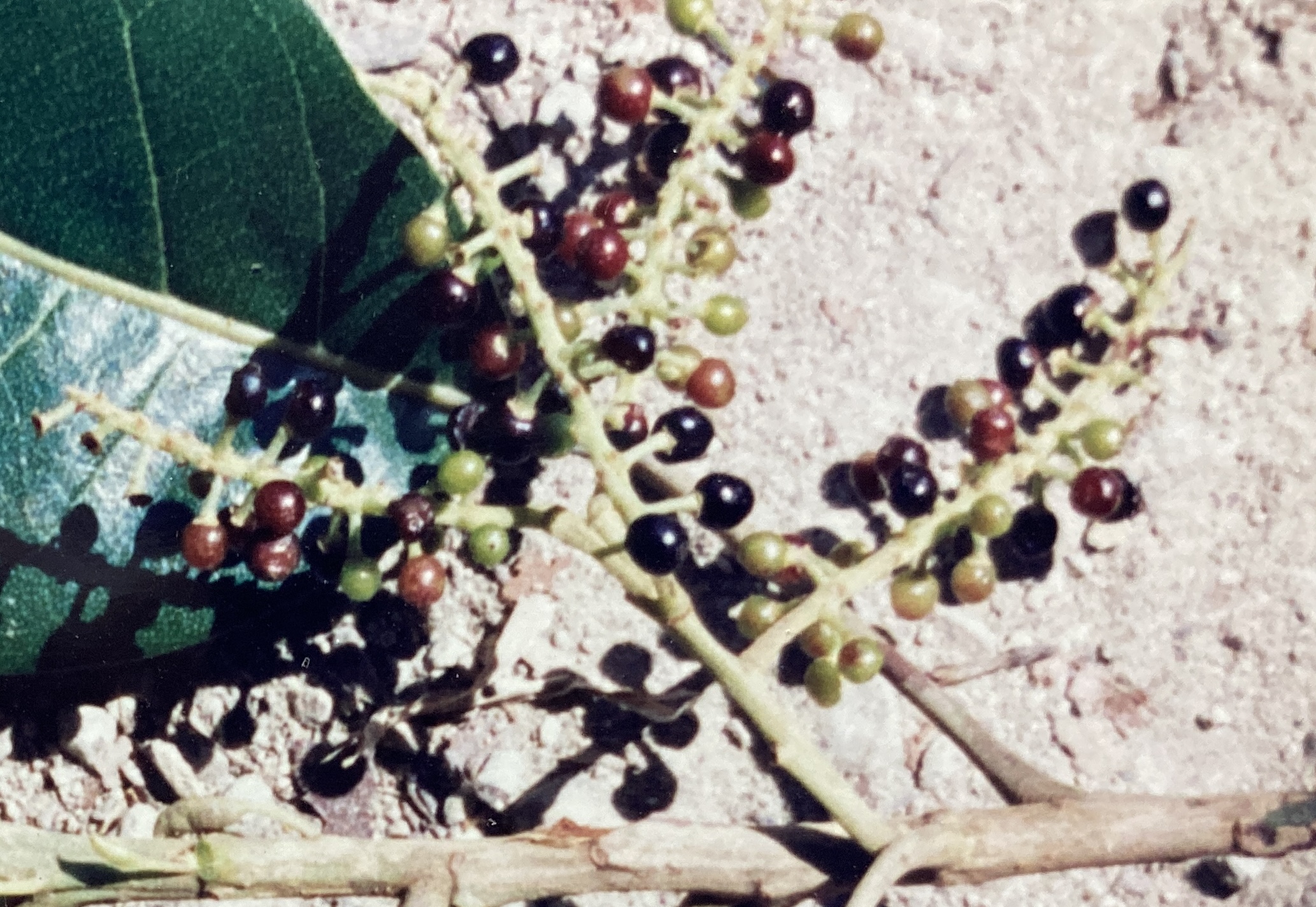 Fruits are produced rapidly after the females flower. Each panicle supports tens of small (3 mm – spherical drupes that ripen from green to a deep red wine color. A single white seed (1.5 mm) is contained within the juicy pulp. Harvests are also bi-annual and their intensity varies from season to season. Each begins about six weeks after flowering, the first lasting from December through January and the second from mid-May through mid-June.